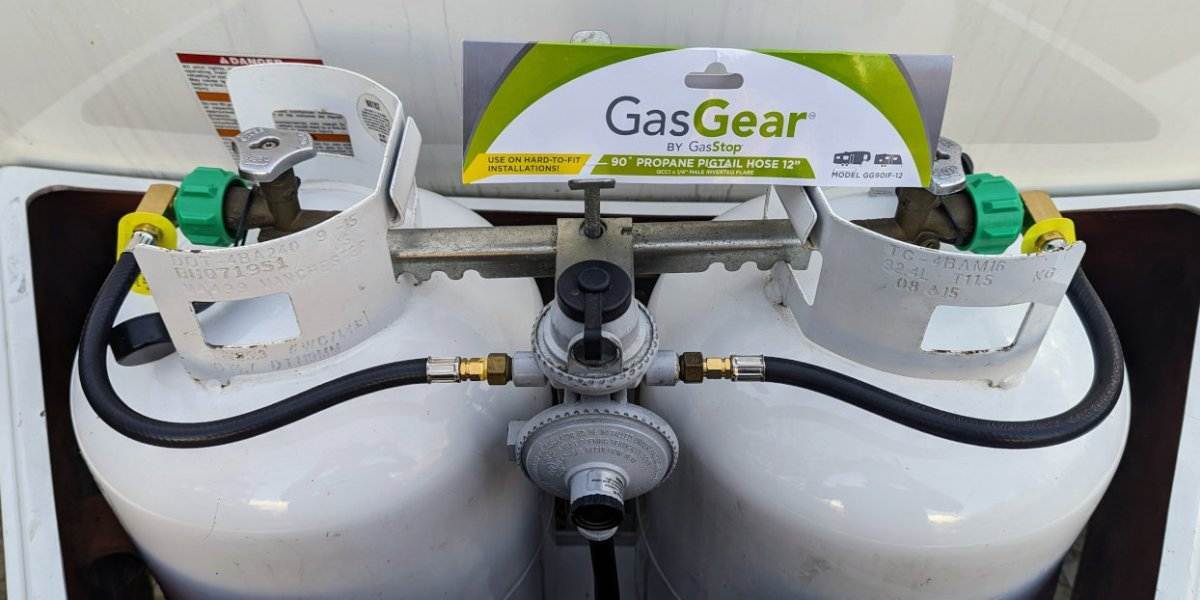 Now that's a good understatement. Your post has generated several concepts that frankly need a relook: The need to have the regulator higher than we had envisionated. (A Geronimo John word) Having enough hose to reduce hose stress especially during tank removal for refill. Using street elbows to get the hose traveling in the right direction from the regulator. Knowing that there is a second set of holes on the regulator. Creative security for our propane gear. Part of the service PITA is that the regulator itself is in the way as the tank installation centerlines are a bit too close. We have room to spare, but all the "OEM Purchased" components are set up for the "standard" set up where space is very critical. We have space to spare. Mount the regulator away from the threaded rod sufficient so as to allow the tightening of the rod handle without hitting or being close to the regulator! And now I'm thinking that the geometry of our OE2 dog house propane hoses and regulators may be space efficient, but it sure does not do us any favors when changing tanks when we have to do a Up and Over maneuver with the tanks. IMO, doing so always is a small PITA. I think we can concoct a better design as we are blessed with space under the hood of the dog house. My assumption is to reuse the tank base, rod, and horizontal tank tie-downbar. Then to focus on the regulator support. From almost 4,000 miles from our Ollie, I'm going to plant a seed to attract some flamng arrows. What if we: A. Modified the regulator bracket to attach to the verticle threaded rod to have two attachment points on the rod and a regulator bracket so as to put the regulator out of the way for service and high enough to be above the liquid level. Double nut one set of the attachment points on the threaded rod to do so. In effect the regulator's location would be fixed. B. Incorporate into the design a simple way to keep the tanks locked down that can be easily removed for service, light and uses a pad lock. C. Increase the hose lengths to facilitate service. D. Use street brass fittings to align the hoses to the direction needed to increase hose bend radius. GJ T Fromthe picture, the 30 pound tanks diameter has reduced a more restricted space for the regulator. -