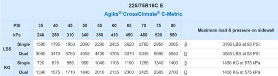 You can follow the 80 PSI MAX spec on the Load Range E LT tire, the 65 PSI rating OTT prints on their DOT label (they used to print 80), or the PSI recommended by the tire manufacturer, based on actual GTW on their load/pressure tables. I/we, most of us, follow the latter. I use any PSI over 45, less than 50, to set them all equal in that range. These numbers allow for 7,800 to 8,360 LBS GTW. On long trips, we carry max 6,600 LBS, so in this range we have spec plus a 20% safety margin. If you run at 65 or 80 PSI, you will cause internal damage to your Oliver. Regardless of brand, LT 225/75R16 tires will all be very close to the numbers you see here. I understand new hulls to have 15" wheels, so get a table for your size. I must have posted this table 6 times now...