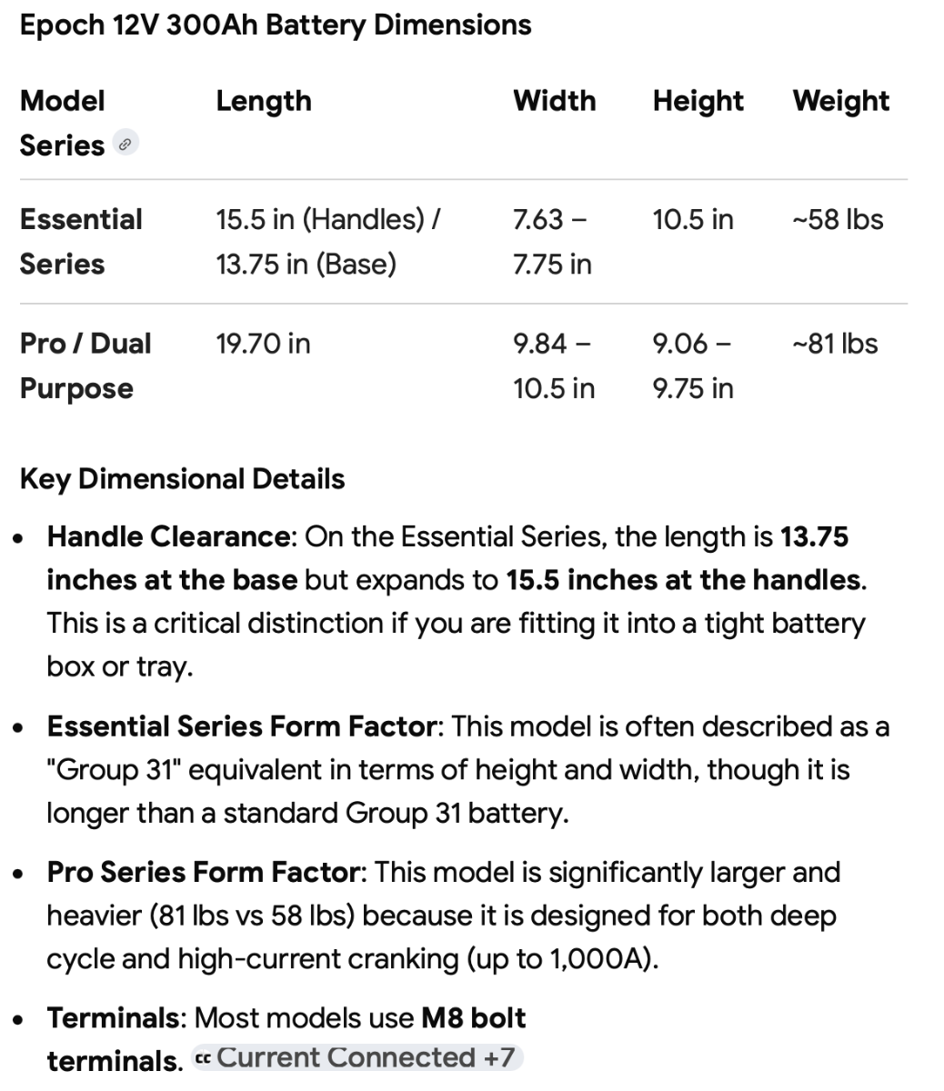 I agree with Mike's comments. BTW he and many others installed two 300 Ah Epoch Essentials batteries. I did that too in 2024 and Jan of this year added a 3rd for 900 Ah! If you provide measurements of your battery bay, we could see what would fit. Don't know for the Elite 1. Also, are you willing to lose the tray? In the E2, 600 Ah fits in the tray and when I went to 3 batteries, I removed the tray and will not miss it since LiFePO4 does not require maintenance. The tray was meant for servicing LA batteries! Would a second Lithionics 260 fit? We think alike here! After all the work I've done in upgrades, we will not conserve! We're now running our Chill Cube A/C on battery! And I would be embarrassed to fire up a generator, never have and never will, and with technology today there's no need to! 😎 We added a 400W Renogy solar suitcase which we use rarely. It does produce 2x our 320W rooftop solar since you get a better angle in the winter sun. These panels are heavy and LARGE! It sits fine in our 8' truck bed, but you would hardly have the space. They're also a pain to move around all day, keeping them pointing to the sun. I remember reading that you (again like us) only stay a few days at each location. Our DC2DC charger is the best tool we have! My take is your best first step is #2 in your list. You need to double your 260 Ah batteries, or better yet, install 600! Page one of my post shows the 600 Ah upgrade and on page 2 upgrading again to 900. Let us know the dimensions of your battery bay so we can make suggestions. 😂