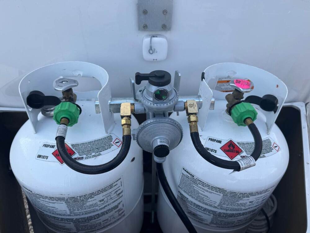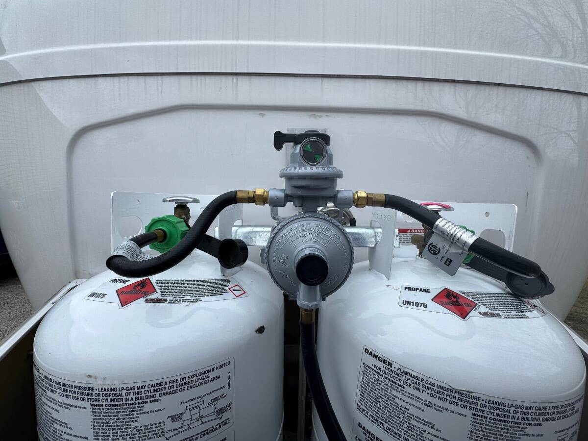 Well we had a “warm” day today so I decided to do one final upgrade that several others have previously done to their propane systems. I got the right angle fittings for the regulator connections a few weeks ago and finally decided to install them. It only takes a few minutes to do in place. The adapter fittings that come on the regulator have check valves built in, so I purchased standard 1/4” street elbows and reused the original adapters to make the connection. One little trick to make the installation easier, with the cold temps, the hose is stiff and feels like it will split if you try to reshape it into the new configuration. If you take the hoses into the kitchen and immerse the rubber part in a pan of boiling water for a minute, the hose will naturally straighten out, and while warm can easily be installed on the tanks and regulators with little tension in the process. There’s a much gentler bend in the hose when completed that should make the hoses last much longer. Before: After: Thanks to everyone who previously made this upgrade and for sharing on the forum. -