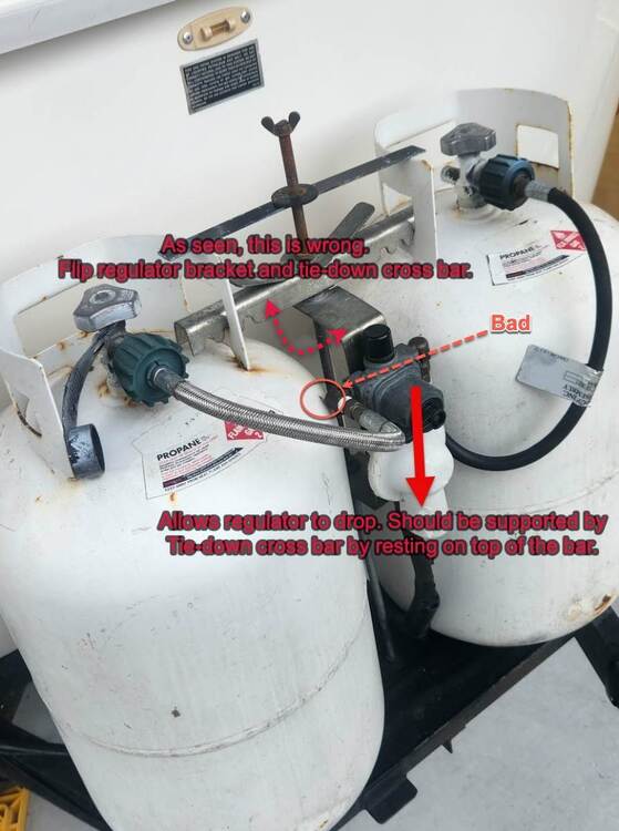 While helping my girlfriend with her 2002 Casita to down-size her propane tanks to new 20 lbs tanks, we found that the propane regulator bracket and the hold-down/tank retainer bar were flipped and allowed the regulator, and hence hose/lines, to drop too far down. This can easily happen to any camper with a dual propane tank system like this. After anyone works on your rig, or you purchase a used travel trailer, ensure things are in order in the propane area. Hope this helps. UPDATE: If you look close at her picture, you can also see that the right-angle LP connector off the regulator has now rubbed into the passenger-side tank. That's not good in any way shape or form - truly bad. I'm sure these have very strict rules by the DOT. Also, in some rare cases, having certain regulators lower than the tops of the LP tanks, may cause certain LP appliances to fail to operate properly.8 points