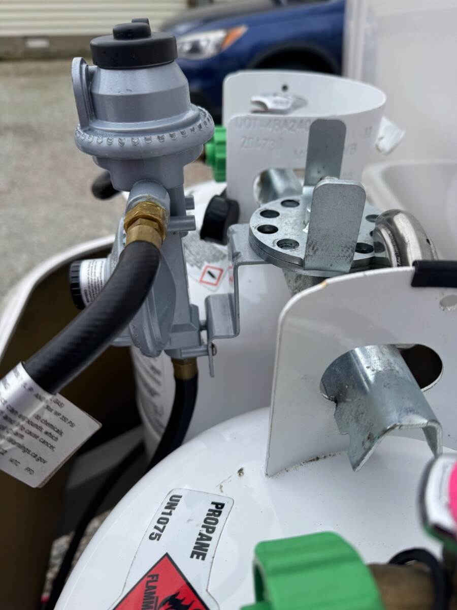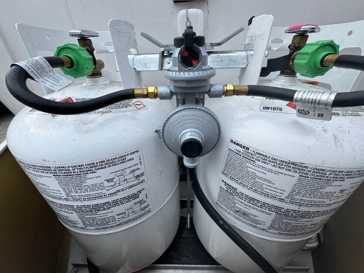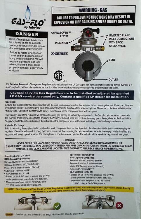 As @Chris Scarff mentioned above, I experienced a regulator failure on our 2023 LE2 and it was not allowing gas to flow at a high enough rate for the Truma furnace to run properly. Rather than making an appointment and going to the trouble of hauling the camper to a local dealer for troubleshooting, I decided to just replace the regulator with an identical model. Currently Oliver is using the Fairview GR-9984. Long story short, the regulator was the problem. When I received the regulator it came with very specific installation instructions, which clearly indicated that the regulator was not installed correctly from the factory. I have no way of knowing if this had anything to do with the failure, and I doubt that it did or you would likely hear about others experiencing this same problem. Nevertheless I chose to install the new regulator according to the instructions. I do believe this is an important detail or Fairview would not explicitly detail these instructions. Below is the instruction sheet that came with my replacement regulator. Notice at the bottom of the page are the highlighted instructions for correct installation and incorrect installation. The next two pictures are my as found installation, followed by my updated installation with the new regulator. Note: I have ordered a set street 90 fittings to reduce stress on the hoses as others have mentioned in their comments As found Updated installation required mounting the bracket to the lower set of holes in the regulator, effectively raising it ~3-4 inches. There is still about 4 inches of clearance between the top of the regulator and the propane cover and the valve selector is still easily accessible for switching.6 points