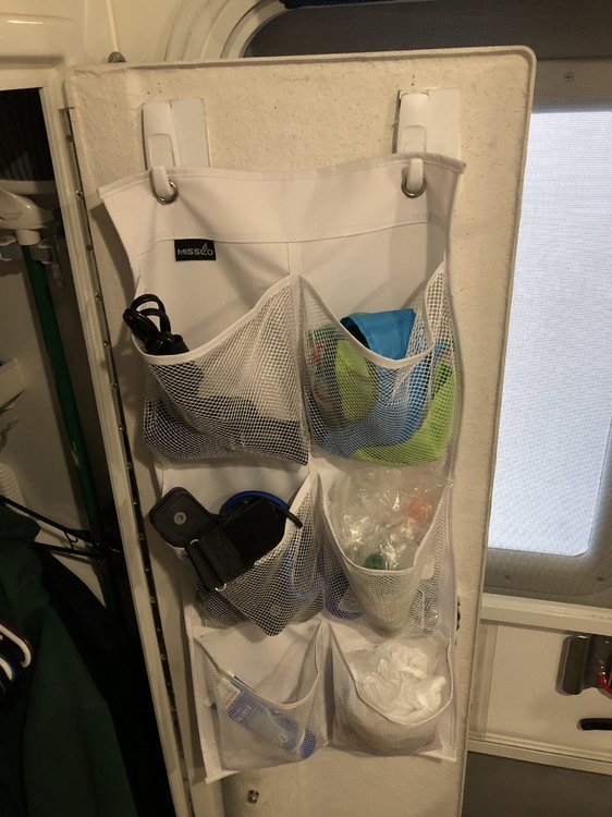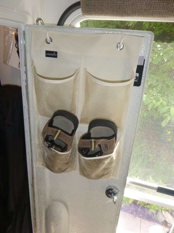It is interesting that there are multiple solutions for mounting shoe pockets. I am a big fan of Command hooks, so I tried those to hang the shoe pockets. Total failure. They kept falling down, I think because the inside surface of the closet door is too rough for the hooks to adhere effectively. So I glued some small pieces of plastic onto the door, and then applied Command hooks; this worked. I think Bill’s idea of gluing on hooks is a better solution. I used three rows of shoe hangers. From the photo, it may appear that the shoe bag interferes with the closet latch, but it does not. I have not had the need to secure the bottom of the shoe hanger to the closet door. We do not store shoes in here, but rather other stuff. I cut off the bottom row that can hold two shoes and used double stick tape to put it up underneath my bed. I keep slippers in there. These are slippers with a suitable sole such that I can wear them outdoors. That has come in handy on more than one occasion. Shoe storage. For a long time, we stored stuff in the basement in milk crates. Most used stuff near the door, less used stuff at the back, underneath the nightstand drawer. I think it was Steve who pioneered the use of an access hatch to the basement under the nightstand, and then Oliver made it an option. I bought a hatch door from Oliver and installed it myself after I overcame my aversion to cutting through fiberglass. I moved the rarely used stuff (i.e. extra hoses, 50A to 30A adaptors) from the basement to the tow vehicle, and I found a rectangular plastic pan that I put in the back of the basement; we put shoes in there. While space is a premium in the trailer, easy access is equally important. To me, it makes sense to use this basement space for shoes, while the hoses and adaptors are further away. [Edit]. When I first posted this, the two photos in portrait mode were sideways, despite displaying the correct orientation both on my phone and my Mac computer. I figured out how to fix this. Open the photo in Preview on the Mac, rotate it 90° four times, and then save. Yes, it looks just like the original, but something in the metadata has been altered. I then deleted the photos from my post and re-uploaded them and all is good. There is something about the software running this forum that does not like photos in portrait mode ...1 point