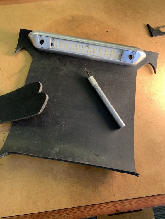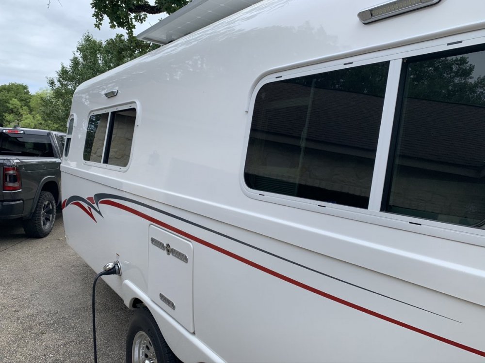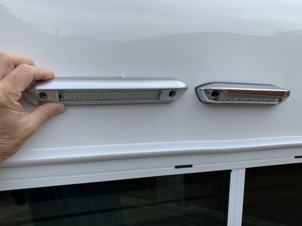 The plastic chrome covers on my porch lights were starting to peel and the rubber gaskets were all dry rotting, causing those ugly black streaks. I’ve tried a few times to seal them with varying success. New ones are about $38. I found some on Amazon that are similar, about an inch larger lengthwise. They have an aluminum cover that is not shiny chrome. They were $19 each. https://www.amazon.com/gp/product/B00ODSBXB0/ref=ppx_yo_dt_b_asin_title_o00_s00?ie=UTF8&psc=1 Light and rubber sheet. Cutting gaskets. The rubber I ordered was much thicker than I needed. Probably 1/8” or less in thickness would be fine. The thickness I had made cutting square edges a bit challenging. Comparison of new and old. After removal of old lights. There isn’t much wire to work with so I cut them off right at the solder joint on the old light. The new lights came with plenty of wire. The remains of my feeble attempts to seal the old rubber is obvious! Cleaned up. I used some 3M fiberglass polish to get the shine back. I decided to drill only one new hole. I hate drilling into my trailer! Since the new lights were about an inch longer it meant the lights would not be centered over the window. I asked Carol to come out and look at the first installation and she didn’t notice the slight off center so I went ahead and did the same for the other three. I filled the old unused hole with silicon. New light. It’s hard to see but the lights are about a half inch off center to the front of the trailer. Lights on. They are about the same brightness as the old. Mike2 points
