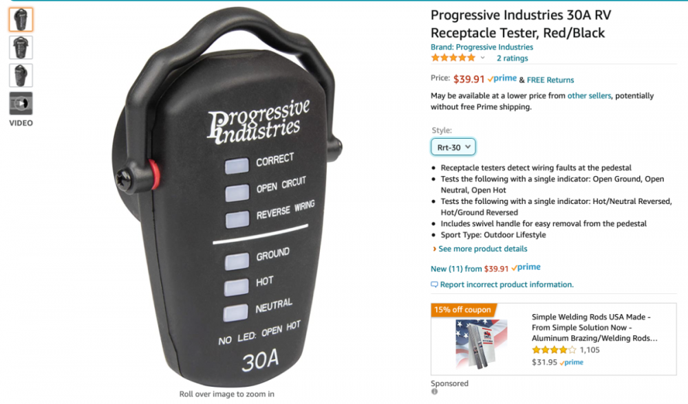 I bought one of these for my trailer toolkit on Amazon. I know it's quite a bit more than the small 15/20 amp testers I also own, but I consider it a convenience for the 30A checks. They come in 30A or 50A, and you can also buy a version that is just a small inline surge suppressor (see second pix) . Or you can by both the Tester an Supressor in kits...1 point