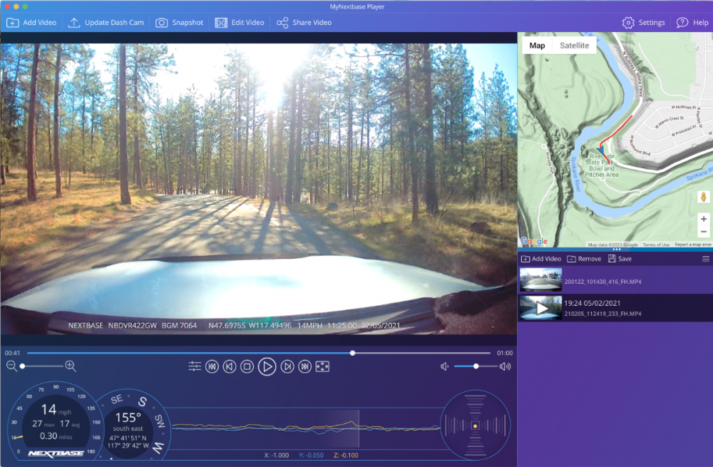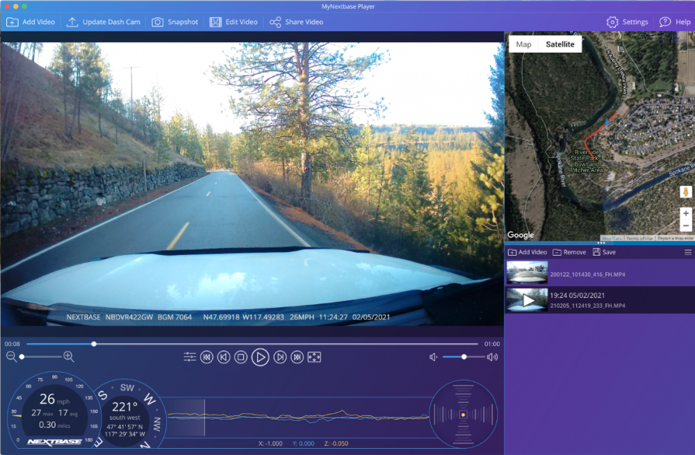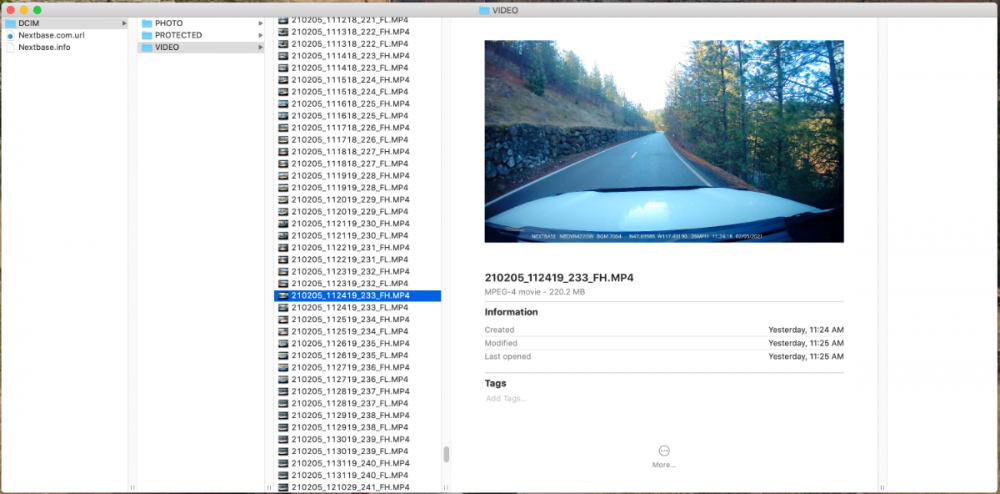FrankC, the NextBase camera takes up to three external inputs, one of them is a rear "over the shoulder" lower res one that simply plugs into the HDMI port on right the side of it. They have hard wired hi res ones, for installing in a rear window for example. I don't know how far away one can be, but recording stuff off the back of the Ollie 35 feet from the dashboard will be a challenge. You canNOT record hi def video using a wireless camera. Here are some screen shots from my computer. The first shows the video file structure, accessed by plugging in the camera with a USB cable. It is a little hard to decipher, but the first digits are the date "year/month/day" So 210205 is Feb 5, 2021. The next digits are the time, Hrs/Mins/Secs and the last is just their sequential file system. So if you are looking for a specific recording, like a collision, and you know when it happened, you can find it pretty fast. Otherwise, you need to have the Gallery or preview or whatever mode picked, and look at the thumbnail images for a clue about where it was recorded. Hi res movies make for BIG files, each 1 minute clip is 220 mb, you can pick a smaller size or lower resolution and frame rate. Mine is 120GB. Here is the "NextBase Player" Mac computer application, showing the dash view on a bright day in shade: And driving directly into the low sun, with a polarizing filter. (Without one, it would be much worse): All kinds of cool info for that particular recording is located along the bottom... A speedometer showing current and max speed, average speed and distance travelled. A compass rose showing current direction, latitude and longitude. A long bar graph showing G forces in three dimensions, and a round version to the right showing the same thing as circles. If you have Internet, the map will show, and you can choose Google Street, Terrain or Satellite, and zoom in or out. And the track and position curser is overlaid on top of that. Basically it's everything a civil defense lawyer would love to have to show a judge if somebody plows into you, like your son's WRX incident.... EDIT: I just updated my camera firmware for the first time, and now there is Time Lapse, a 3 minute or 30 minute setting... A 3 minute video plays back in 30 seconds, a 30 minute plays back in 5 minutes. A little too fast a frame rate for me, but it will be fun to experiment with it. Here is a sample I found; ... https://www.youtube.com/watch?v=9UziEtLlp6E John Davies Spokane WA1 point