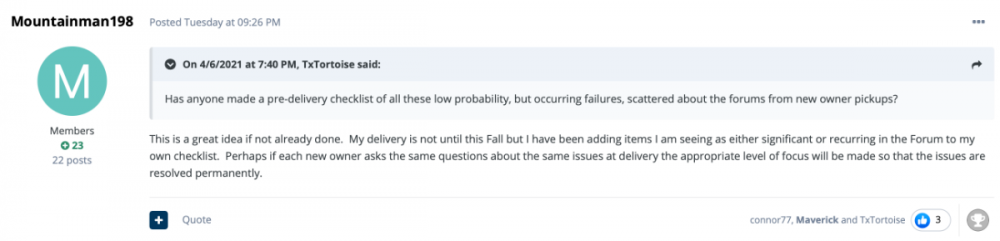 Here is a draft delivery checklist prompted, in part, by comments regarding a recent inverter-mount failure (see below). This delivery inspection checklist began with one used by NCeagle for his delivery, to which I've added items. The list is almost certainly incomplete -- what other items would you suggest to help new buyers? Thanks to Oliver for providing this educational ad-free forum, and to all of you for your forum posts that have contributed to this list. This open-dialogue forum is IMHO a huge asset to the OliverOllie Inspection Checklist (draft 4-9-2021).pdf travel trailer brand. I divided the list into two parts: (1) the actual delivery day inspection and (2) items for further inspection at DCSP. I plan on testing the list in 3 weeks when we pick up Hull 792, and will refine the list based on this experience (and with your additions, suggestions, comments, etc). The list is in pdf form. Once updated, I'd be happy to send out (or post) an xlsx version.2 points