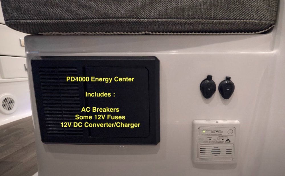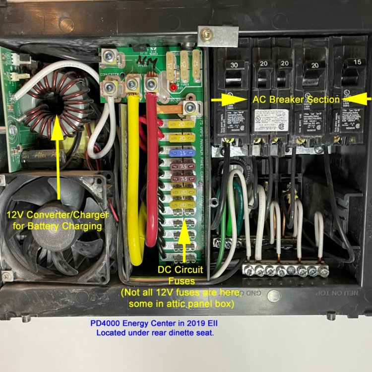 Ray and Susan - the pix John is posting are of things likely not in your trailer either because he's added them or they from the earlier model year EII's. Earlier models up through 2019 had a Progressive Dynamics 4000 Energy Center under our Dinette Seat. (PD4000 Energy Center under dinette seat, but with Cover OFF) - The PD4000 unit housed AC Breakers, SOME DC fuses (but not all) and the power Converter that charges our batteries. The rest of the DC Fuses were in a small fuse box in the attic next to the surge protector display. In the newer models like yours they switched to a new set of energy panels for AC Breakers and DC Fuses (all in one convenient place under the dinette) as shown in your pix. They also changed to either a 2000 W or 3000 W combined Xantrex inverter/charger...which is able to be programmed for a charge profile for Lithium Batteries from a variety of vendors. So looking at some of our posts for other pre 2020 unit pictures could be a bit confusing if you are thinking your missing some new or special feature. Craig1 point