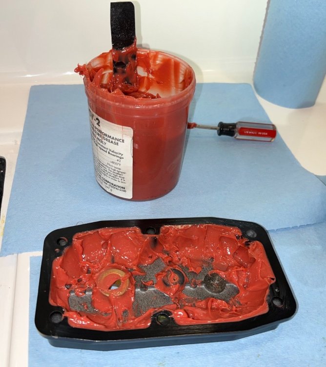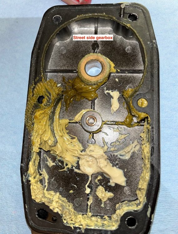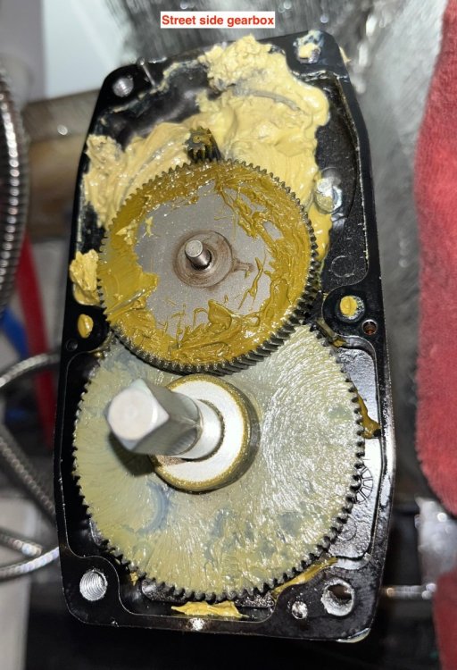 Grease the upper cover: Set the gear and shim down over the lower part, align the gasket and install the cover and the four bolts. Tighten the three set screws firmly, be careful they are steel in aluminum. Clean off the top and make a record of the service: Test the jack for proper operation and shift all your tools and stuff to the other side. My street side gearbox looked very similar - too little lube, some gear wear: Each jack took a couple of hours, most of that time was cleaning out the old contaminated grease. A future service might be a whole lot faster, you could just take a look and add some more CV-2 if needed. I do NOT recommend leaving the old white lithium grease in place, it will not mix well with the full synthetic, and you should get all those black metal particles out!. John Davies Spokane WA2 points
