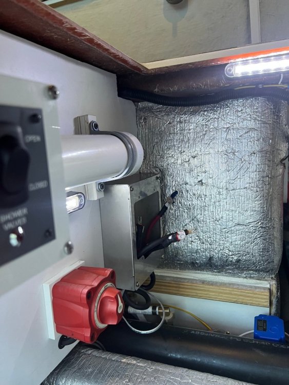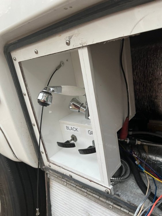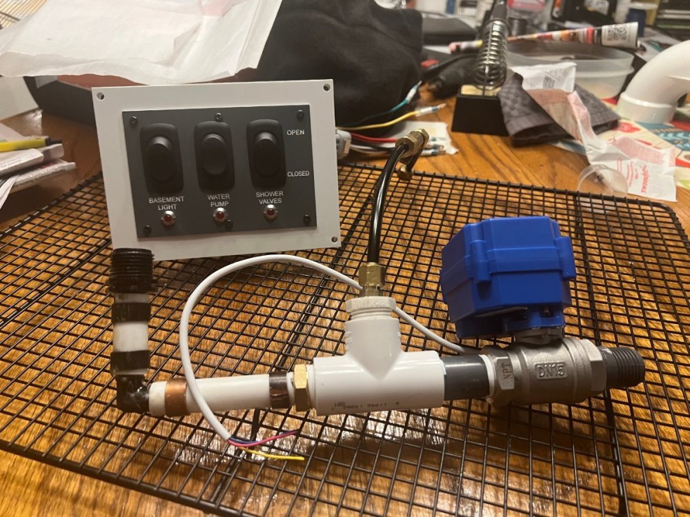 I added two motorized valves to the water lines going to the outside shower. I also added an air line to each water line with check valves (to prevent water from back-flowing into the air lines) to facilitate blowing the lines clear for winterization. The air line runs to the front of the trailer to a quick connect. I can use either the compressor system in the Silverado or a compressor at home. I also re-built the outside shower and dump valve box. Here is one of the motorized valves with the air connection prior to installation. Here's a look at the control station mounted in the basement.1 point