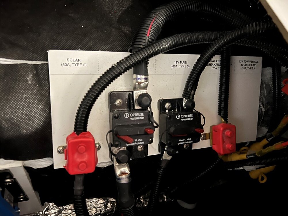 Make sure the red lever on the Optifuse resettable breaker is pushed inwards (see arrow on picture). The Optifuse breaker on the left shown in the photo is in the open state when the lever is popped out like that. The Optifuse on the right is closed. The red rubber covers on the outer two items are just contact covers on the other self resetting breakers. The Optifuse breakers can manually opened by pressing the little red button on them (which will make the red lever pop out), and then pushing the red lever back in to reset. And this is my first post in a long while since we sold our Ollie. A sad day when it was towed away, but it went to a good new owner. We’ve moved on to other travel plans now. But I still lurk here on the forums occasionally 🙂1 point