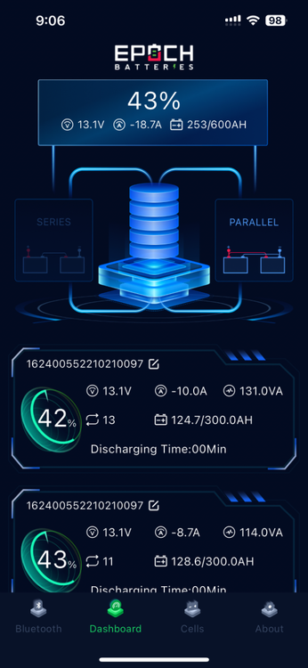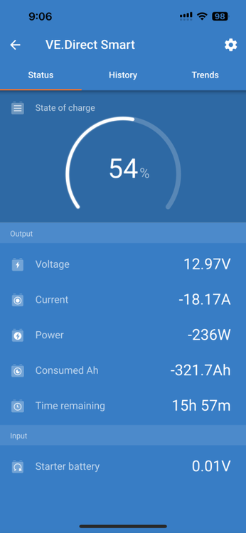 We have to get to the bottom of this, as I have also found the Victron app or the Victron SmartShunt to be unreliable. i do not have the OTT installed Lithionics but instead self-installed 600AH Epoch batteries. We also have an Epoch app that regularly shows a lower SOC reading. Note the two pics. The Victron app states we have 54% SOC but it also states AH consumed at -321.7A. This is more than half of our 600 AH which calculates to 46% SOC. The Epoch app (y’all have a Lithionics app) appears to be more accurate showing 43% SOC. Since the battery app is a more conservative reading and appears more accurate, we count on this number when traveling! Hope this helps!1 point