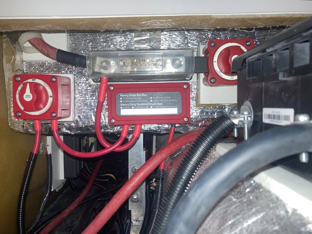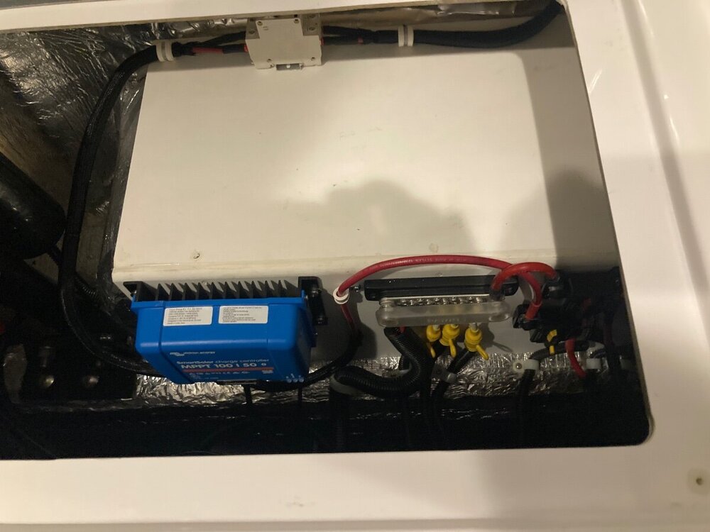 Finished up the rest of my solar install. Went with the Victron 100/50 controller installed under the street side bed. Took the opportunity to clean up this area and made some room for any future upgrades with some PVC sheet I was able to find at local Home Depot. Also wanted to clean up the battery compartment so I have only (+) and (-) 4/0 cables in there. Forward street side bed under the pantry installed victron shunt and a negative bus bar. Under rear dinette installed a positive bus bar, battery to inverter cutoff switch and a solar cutoff switch. Finally installed the MPPT and shunt displays on forward street side cabinet above the dinette. I wanted to leave the area above the radio open in case I decide to install cerbo gx display later. Had to purchase the longest v.e.direct cable victron offers in order to make this run. The only area I get wires pushed through was from the basement to the rear attic by following close to the AC drain line. I was then able to route the wires across the back of the upper cabinets.1 point