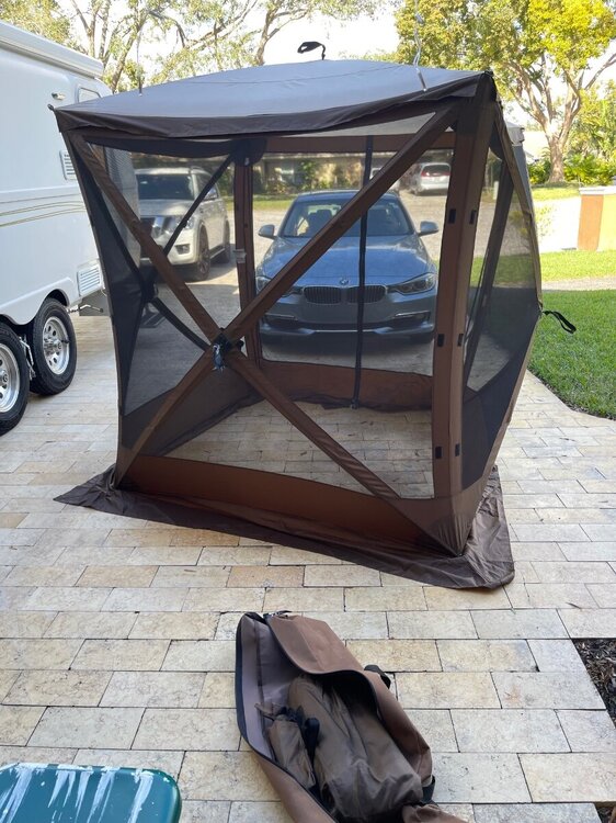 I've boondocked at the Lower Sunshine Reservoir just outside Meeteetse, WY for a number of years. Given that the camping area consists of basically a sagebrush "meadow" overlooking the reservoir, there is no shade other than what the Ollie provides either early in the morning or later in the day. Virtually every time I've been there I've set up my small (four sided) Clam screen shelter not necessarily to shield me from bugs but more to give me an additional place to relax after a hard day of fishing. When setting up my Clam I virtually always not only stake the four corners down but I also use the three ties that come off the side center hubs and stake them. This is to protect the Clam from any sudden winds that just might come up and it has worked very well withstanding some fair strong winds - until this year. I was in bed at about 11:30pm when the Ollie started rocking. After about 5 minutes of this I got up to look out the rear window to see how the Clam was fairing - not well. So not well that it wasn't even there. Just to make sure or, perhaps, get the Clam before it was swept into the reservoir I jumped into a pair of shorts, donned a head lamp and ventured into that wind. Yep - not there! In fact, no sign that it had ever even been there! Barely being able to stand I turned to get back into the camper and a light colored square object caught my eye about 150 yards away. Could it be? Yes it was. The four sides of the Clam had collapsed but the roof remained fully open. I managed to get over to it, I collapsed the roof, carted it back to the truck and did not inspect to see what was the extent of the damage to it until yesterday. Other than being lucky that the entire thing wasn't lost in the reservoir, I was reasonably certain that the screening or the nylon material or the fiberglass poles or the hubs that hold most of it together would be broken. Perhaps I could salvage something from it for potential repairs to the new Clam that certainly was in my future. Well, all of the screening didn't have a scratch on it and the poles and hubs were fully intact. The roof does have two tears and three abrasions as well as each of the four nylon webbing tabs that are used for staking down the tent had been completely torn from where they were sewed. The abrasions can easily be fixed with dabbing on a little "E6000" and the two tears (one at about 1/4 inch and the other at about 1 1/2 inches) can be repaired with "Gear Aid" repair tape. Of course I also sewed the four tabs back on. I'm not sure if the Clam was purposefully designed so that these tabs would "release" rather than tearing the tent apart, but, it worked that way in this case. Finally, I should note that I found the four tabs the next morning after the wind storm, still staked to the ground as I had originally placed them. And, one of the three ropes used to tie down the sides was broken. I use short bungees that have metal hooks at the ends and place the metal hooks around the ground stakes. All three metal hooks were straightened! I've always liked my Clam but now I'm a true believer. Bill0 points