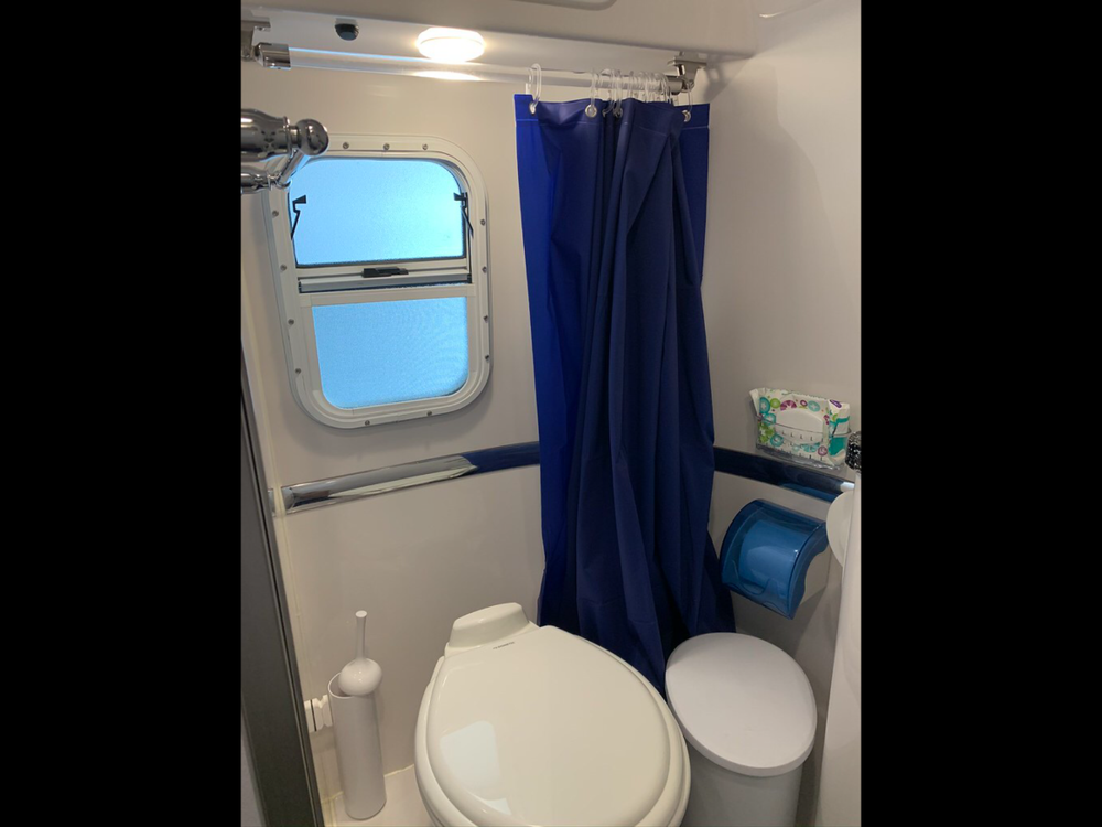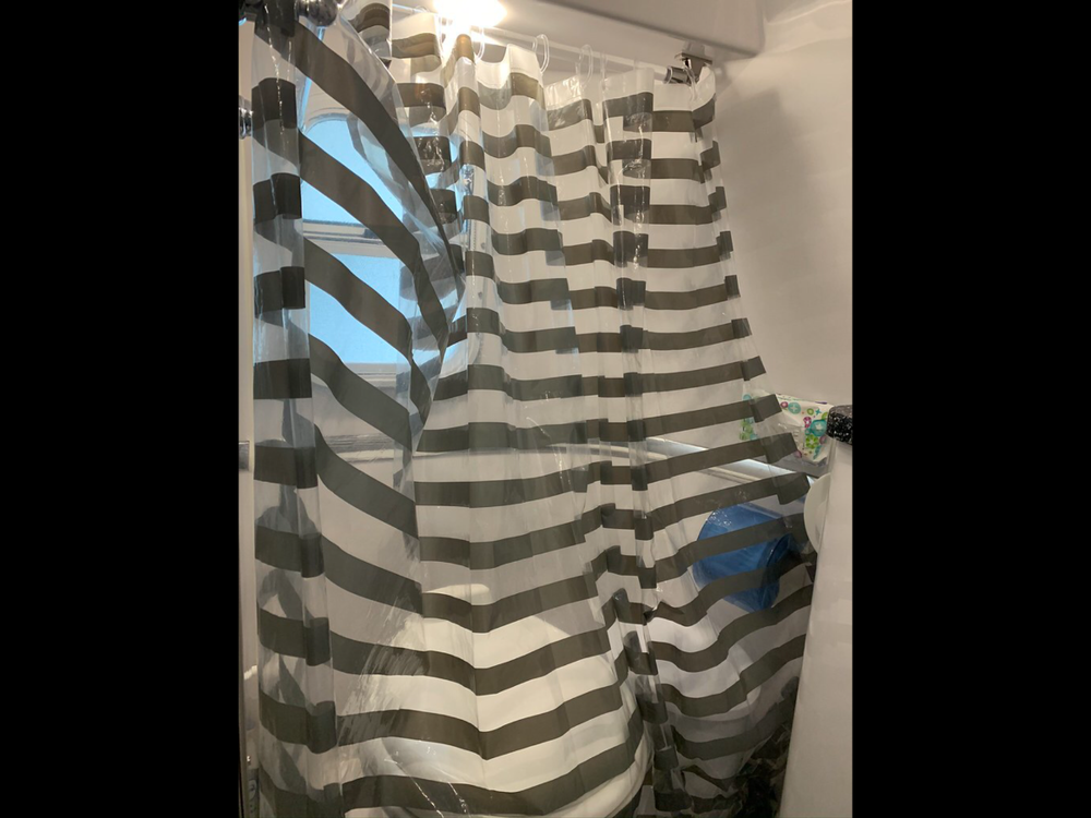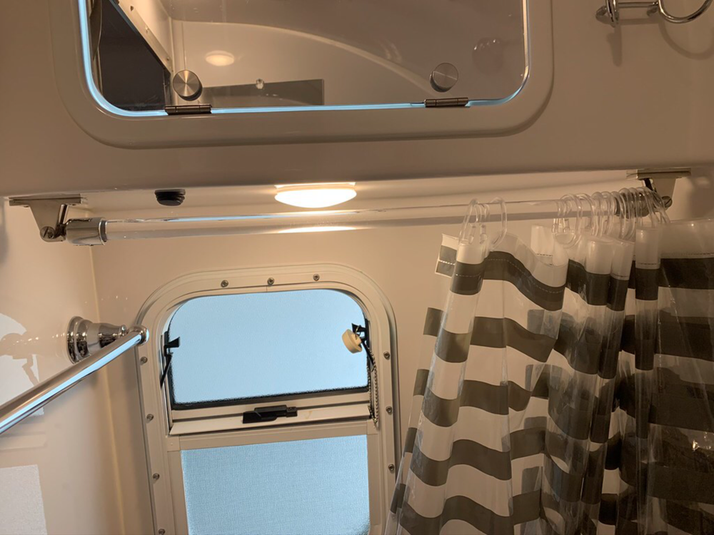 If your shower track idea doesn’t pan out, alternatively many have installed a shower rod under the cabinet. My install did require some drilling, but much less conspicuous than in the ceiling. A standard curtain is best cut to length for optimum fitment and functionality. The shower curtain can be stowed in the curved corner, used to shade the window, covers the head and towel rack when in use, and provides more space when showering.1 point