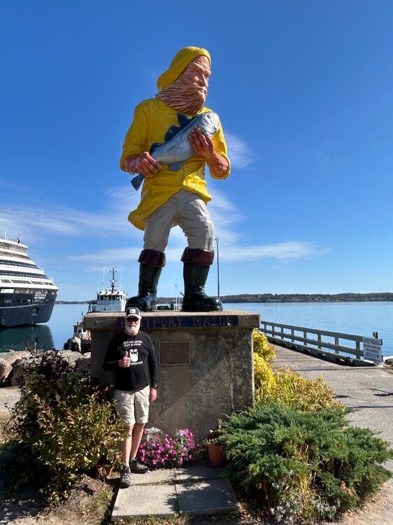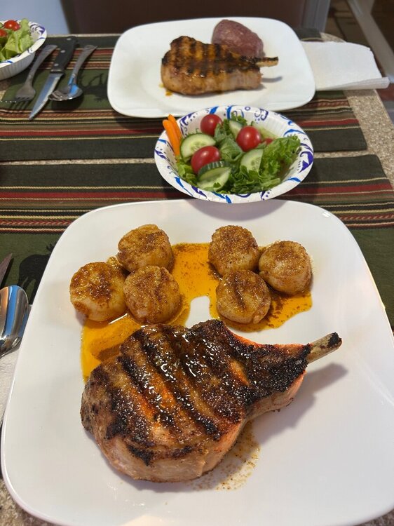Yesterday we left our base camp and took a little road trip north to Eastport, ME and had breakfast. There was a Norwegian cruise ship in port. We were fortunate enough to get to the local dinner before the mass of peeps began streaming off. Eastport is a neat little sea side town and well worth a visit. We then motored on to Calais, Me and briefly checked out the fair on Main Street. Then crossed over the border in Calais and drove to St Andrew’s, New Brunswick, Canada. 🇨🇦 A very cool little town with a really scenic water front. Lots of shops and a lot of restaurants. We spent about half the day there and would go back for sure. Late afternoon we returned back to base camp we were ready for dinner. I cheffed up blackened fresh scallops and bone in pork chops. The weather has been spectacular and the fall colors continue to pop! Eastport, ME. My bride could not resist..😄 The fresh scallops and blackened bone in chops really turned out great. 👨🏼🍳 We always say it’s not fresh seafood unless you can hear the waves crashing. View from our windows.6 points