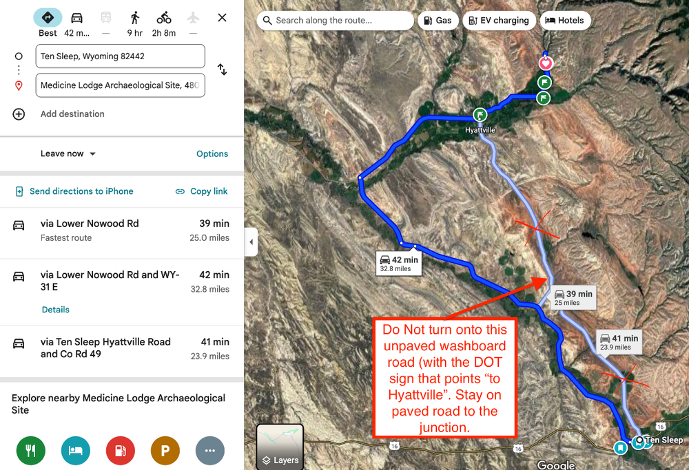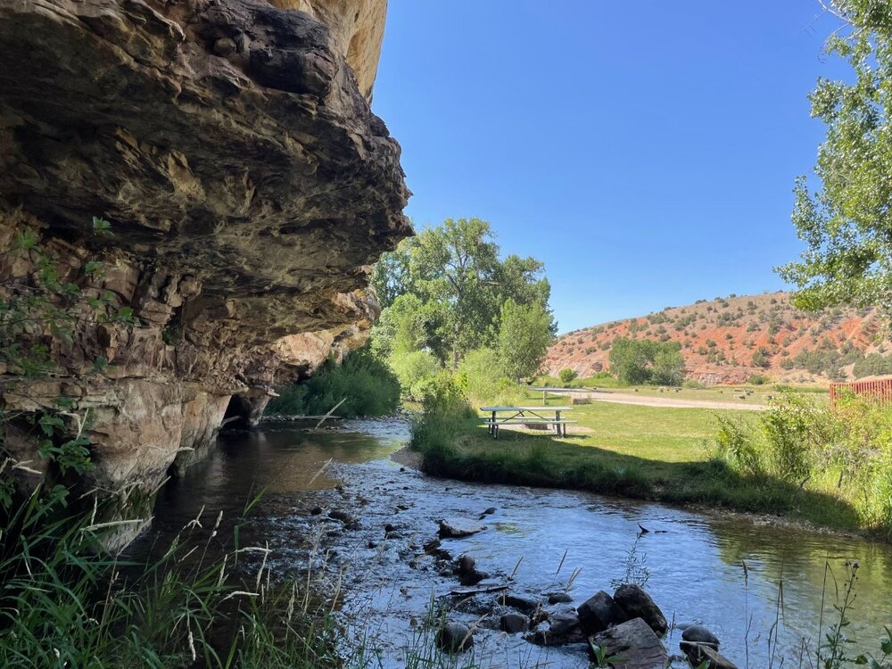 I've greatly enjoyed time at Medicine Lodge Archaeological Site SP and campground. The state park is a real gem, with hiking trails, petroglyphs and pictographs, a beautiful creek (fishing permitted with license), flora and fauna -- a green oasis along the western slope of the beautiful Big Horn Mountains. Archaeological digs have revealed over 10,000 years of human occupation at this site -- a rare find in North America. There are dry camping sites, electrical sites, reservable sites and some that are strictly FF. If you decide to come here, be sure that you are: (1) looking at the correct campground, as there are others called 'Medicine Lodge' that are part of the Forest -- and those might be fine, but this one is within walking distance to most of the park's public areas; (2) carefully studying the route and the road conditions before you venture away from wifi/cell reception, because google and apple maps will suggest a road that is a washboard dirt road -- and there is even a sign that suggests it's the way to Hyattville -- but there is a better path. You can read about the park here: https://wyoparks.wyo.gov/index.php/places-to-go/medicine-lodge I used the "Lower Campground" -- sites 1 through 9, but there are very nice sites scattered throughout the park, all of them along sections of Medicine Lodge Creek. Lower Campground, site #7 is in the middle -- other sites are around the perimeter. Some of the petroglyphs view of Medicine Lodge Creek in the park If you're coming from the west, take 31 from Manderson. If you're coming from the east (south) take Lower Nowood Road (NOT the Ten Sleep Hyattville Road) and STAY on Lower Nowood Road until you reach the junction with 31 (Do NOT follow the green highway sign that points to the unpaved washboard road to Hyattville). Go east on 31 from Lower Nowood and turn on Cold Springs Road, then to County Road 52 (unpaved) following signs to the park.1 point