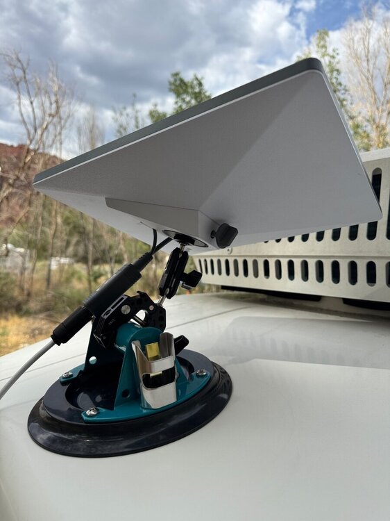 Have you field tested your setup yet? Bought mine a couple months ago and making first use at camp this week. Went with the Airstream Suction Cup Mount Kit plus an extra 4’ pole section for at 12’ lift. These mounts are angled and work great since the Oliver has similar side concours as AS. Real impressed with the SLM, was able to stream a movie while heavy weather moved through the area last night. Been using a FPB with the suction cup mount for five years for a windsock and weBoost with no issues; these suction cup mounts rock!1 point
