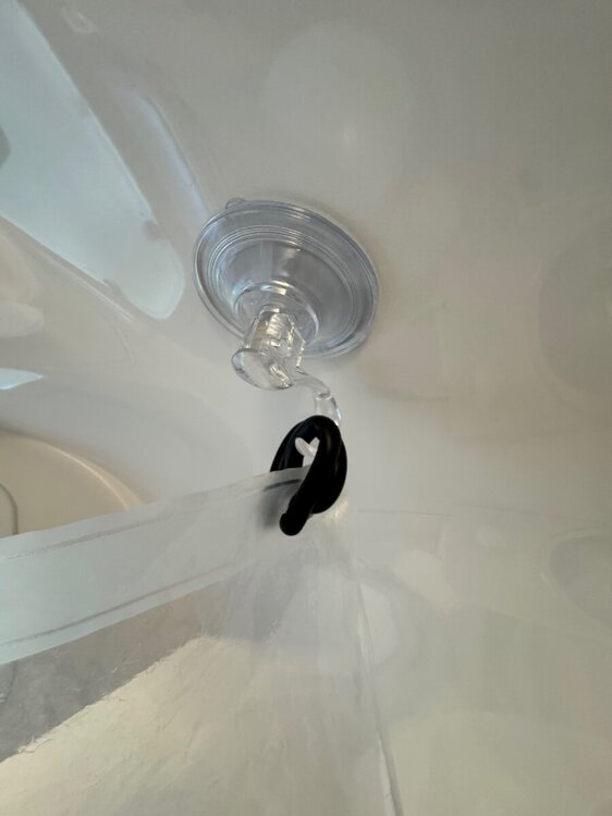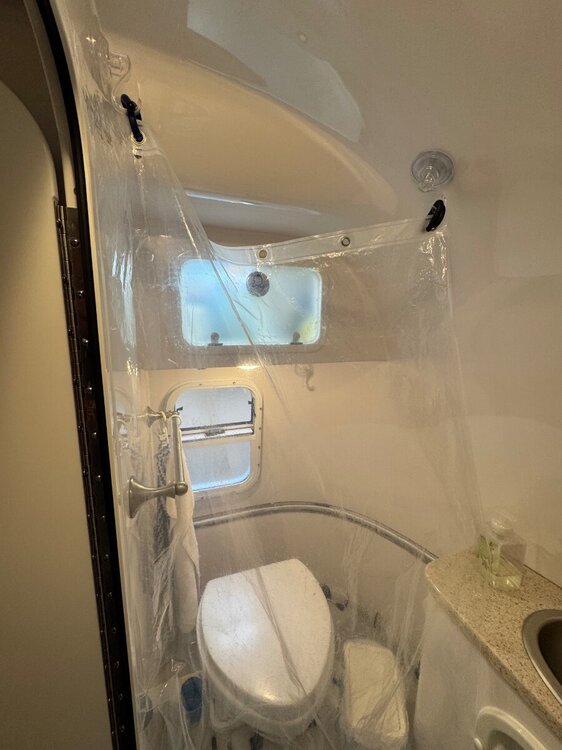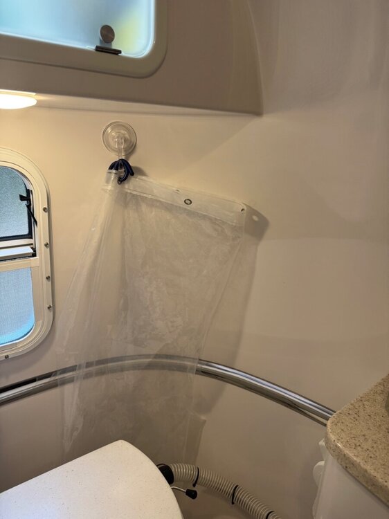 Several years ago another Oliver owner had some vinyl track material left over from a project he was doing and gave me the left over material. I have not looked, but I imagine that the material can be found on amazon. Along with the track material he gave me the plastic pieces that run in the track. I carefully heated the one piece of track that is attached to the curved area and bent the track to match the curve. Both track pieces are attached to the ceiling with 3M double sided tape. The curtain is a standard shower curtain with one upper end cut and hemmed in a radius to match the curved ceiling area. Half of the curtain covers the doorway and the other half covers the toilet area.2 points