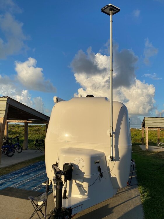 To be clear all, I’m talking Starlink Mini due to it’s size and fact that is what I have experience with. I think it’s good to have a variety of mounting options and locations given the vast diversity of situations one will encounter. I have found when traveling that simply placing the SLM on the TV dash provides adequate service regardless of the direction driving. With magnetic mounts the SLM is securely affixed atop the TV whether underway or stationary, and when in camp the TV can be parked in clear view some distance away and still have strong Wi-Fi connection in the Oliver. I think the best of options is to simply position the SLM on a nearby table, ground/tripod or any workable surface for a ‘quick and easy’. And then there’s the mast, it takes all of five minutes to setup and no way, nohow cumbersome! Currently shown here at our Galveston Island SP campsite at full height to test use in high wind gusts, no problem!2 points