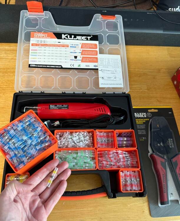 Darn it. As others have had before, finding the intermittent voltage issue with trailer brakes and newer trucks can be frustrating. I still have a bit of an issue. So, the only thing I have not checked or changed are the brake assemblies and the brake wires inside the axle tubes. I’m pulling them out this week before my Egg rally in live oak, FL. I just received my new 12 AWG wire from eTrailer and new higher end crimpers, for non-solder connectors. Adding to my tool supply. Also got some new toys. Solder seal wire connectors, just a few, (1100 count). With a mini heat gun with deflector. I will find the voltage issue. I did check, clean, and improve any and all grounds in the trailer this weekend. The test drive didn’t reveal any brake voltage issues, but I’m removing the axle wires anyways.5 points
