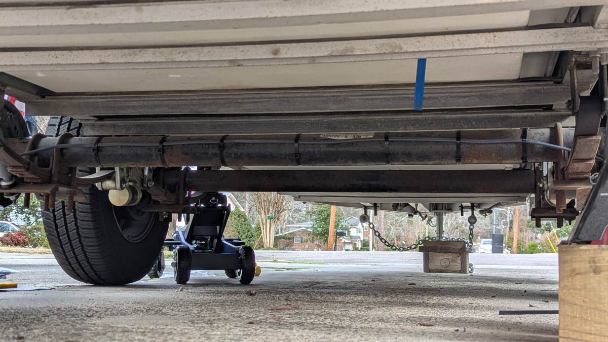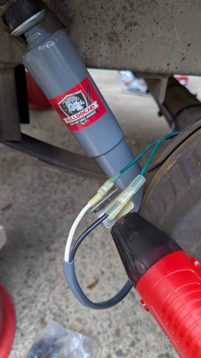 Well, it was a good day, I now have some new toys tools to help do all this type of work, and WoW, what a different they made. I finally got a creeper, a set of ratcheting wrenches, and an off-road hydraulic roller jack which reaches 29 inches in hight. It's nearly 21 inches to the Oliver frame from the pavement. Man, it was a breeze to do now. I think putting the wheels on the creeper took half the time of the entire project. LOL The ratcheting wrenches were SUPER handy for the new Bulldog shocks - I've wanted a set for years. My new high-end crimper made great crimps on the new brake wire now running along the rear axle. I have not gotten to the front axle yet, got rained out. My old shocks were all dead, which "someone" at Oliver said were "good" just two summers ago. All four shocks would not open on their own and had to be pulled apart and were much easier to push closed than the new Bulldogs. I'm now ready for next week's trip to Florida's Eggs & S'Mores Rally at the Suwannee Music ground in Live Oaks. Can't wait to see "the gang". We'll have at least 4 or 5 Ollies in our group, along with Casitas. My Alcan springs should arrive next week, but no time to put them on yet. I used heavy duty exterior zip ties to secure the double insulated, 12-gauge, 2-wire brake wire to the axle. The eTrailer part number from eTrailer is C46GJ. My new mini heat-gun with wire shield did the trick nicely on the shrink tube butt-connectors. I was also able to find the serial number to the rear axle for future replacement - thank goodness for the new creeper. IMPORTANT: I did find a bad area on the wire I pulled out of the axle, which appeared to have been "calked" over, or something odd like that. Also found a break in the wire insulation of the brake assembly itself - it's getting brittle. All brake assemblies will be replaced after Alcan spring installation, or best yet, just get the axles replaced with new brakes. Then, the entire under carriage should be good-to-go. Passenger-side voltage is now at 2.98v. Very nice. Here's a quick video of the new -vs- old shocks, a short race to the finish. Old-Oliver-shocks-verus-new-bulldogs.mp44 points