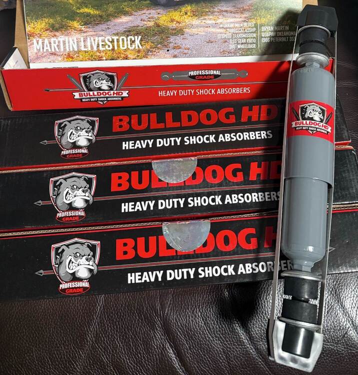 The shocks are bulldog shocks. Bulldog HD Shock Absorber Replaces 555001 For Trailer Leaf Spring Retro Kit They were ordered on-line for around $145 from 4 state trucks. 19-050000007: Bulldog HD Shock Absorber Replaces 555001 For Trailer Leaf Spring Retro Kit3 points