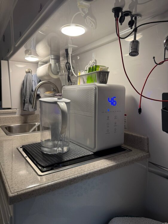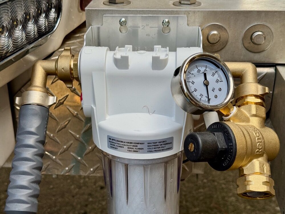 I've seen similar filter and water softener additions. Here's mine. I recently saw that James at FitRV released a single 2.5" X 10" water filter element to replace the standard 3-stage system. I've considered one of the smaller 3-stage systems as an upgrade, so I thought I'd give this a try as a less expensive alternative. Of course using one 3-stage filter instead of three separate filters is going to mean a shorter interval between replacement. But the cost difference should be negligible, and I won't have to find a place to store a 3-stage system. Here's the FitRV video and article: YouTube: https://youtu.be/t_SQNVapBEw?si=FfufAl7n4p_80Eys Web article: https://www.thefitrv.com/rv-tech/our-new-rv-water-filter-the-fit-rv-3-in-1-filter/ I bought a cheap filter canister from Amazon, that arrived with horribly oversized 3/4" NPT pipe threads, and enough slop that the filter moved over 1/8" up and down. That's not going to work at all, so back it went and a GE housing was ordered. Much better! I assembled with a 3/4" NPT to 3/4" GHT (garden hose thread) on each end; one male-to-male, and the other male-to-female. Then I gave it a test fit on Curiosity's rear bumper. Dummy! The hoses would interfere with the trailer body and the drop down sewers cover. :facepalm: Back to Amazon for a pair of 90° 3/4" GHT male-to-female connectors. In hindsight, I should have used a 90° 3/4 NPT to 3/4 GHT set, but looking today, I couldn't find that combination. This also allowed me some flexibility in the angle of the input and output. Back when I ordered the Oliver, and spent those agonizing months waiting for delivery day, I accumulated a bunch of bits and pieces to get ready to go. (Didn't we all?) One was an adjustable water pressure regulator. I didn't realize that Oliver would supply a fixed 40 PSI inline regulator, and the inline unit was convenient to store with the Camco inline water filters I've been using. So now's the opportunity to get it off the garage shelf and put it to use! I drilled and tapped two threads into the side of the bumper support, and screwed and LocTited in two stainless screws. These are used to hang the whole contraption while in use. It'll be stored in my bucket during transport. I hope this is helpful for anyone wanting to upgrade from an inline water filter. List of components: GE Filter Housing: https://a.co/d/7cbaS28 FitRV 3-in-one filter: https://a.co/d/b0NzDt8 Camco 4' Potable Water Hose: https://a.co/d/eVeV4BJ 3/4" NPT to 3/4" GHT fitting: male-to-male (2-pack): https://a.co/d/5MopLFL 3/4" NPT to 3/4" GHT fitting: male-to-female 2-pack): https://a.co/d/dE1gWDC 90° 3/4" GHT Elbow: male-to-female (2-pack): https://a.co/d/24kw8xO Teflon tape for NPT threads Total cost: $133 plus tax Question: The fixed pressure regulator that came with the Oliver is 40 PSI. I've set the adjustable water pressure regulator to the same 40 PSI. What pressure do those of you with adjustable regulators use?13 points
