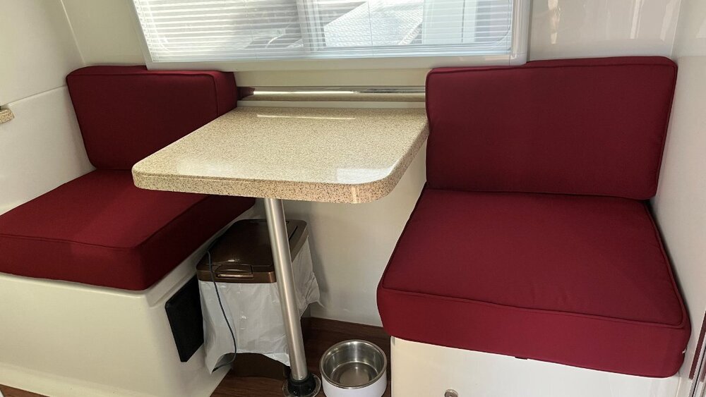 They put us on their November calendar. After running our trip, every time I sat on the old cushions, I thought it would be a shame to merely reupholster with new cloth yet keep the 9-year-old foam. When we dropped them off, I asked about new foam. He said the quality of foam for seating they carry is far superior to what we showed them in the old cushions. We went with 24x25" bottoms with 5" new foam (1" taller) and with the batting and fabric, the cushions are closer to 6" tall. We had 2" clearance under the window frames with the old cushions. The new ones just fill the opening and stay nicely. Went with the original sized 4" foam for the seat backs. All new foam, batting, fabric, zippers with newly corded edges. Chris loves the color given her Red, White and Blue Oliver theme! We spent just under $500 out the door. Which for me was better than the $350 for upholstery only. Soon, she will look as good as she tows or provides inverter power!15 points