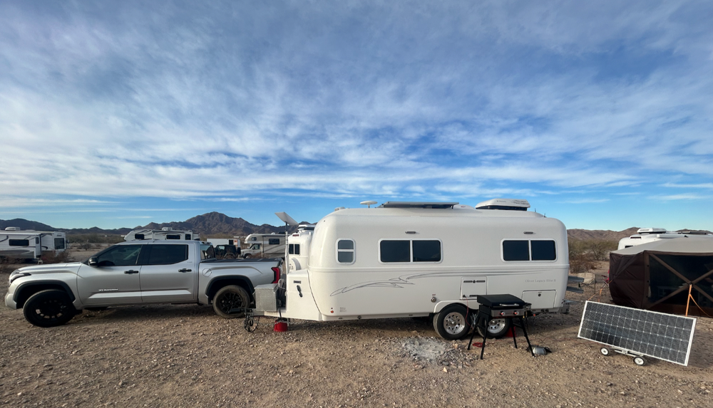 FYI: Quartzite "Proving Grounds" -- We opted-in on a Solar Tracker at the owner's rally last year which Coy and his business partner, Joe designed. It's been running straight through since arriving at the Q last Monday. The tracker uses onboard GPS, MPPT charge controller, and other programs to "track" the sun's progression throughout the day. It stows itself at sunset then "wakes" up after sunrise, resets its position and its 200W solar module angle to optimize power generation. Even with the low winter sun angles here at the Q, the tracker get's our 300A-Hr Battle Borns back to 100%SOC by noon-ish to 1pm. We're still putting it through its "shake-down" cruise during this trip. More later...13 points