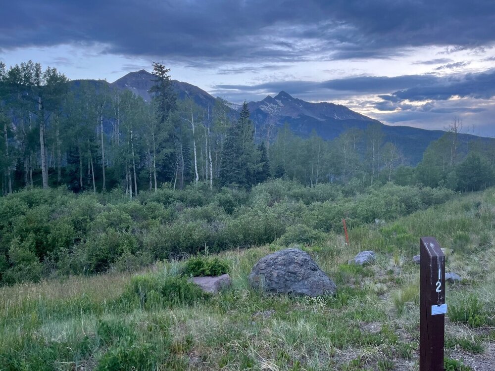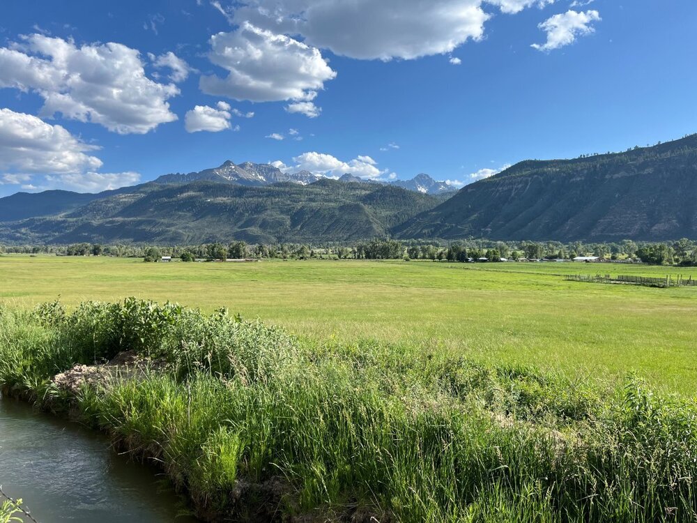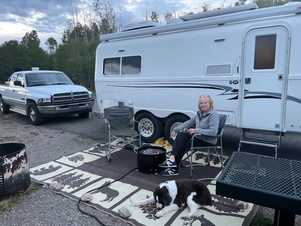 BaseCamp550 - just S of Ridgway CO, 8 miles N of Ouray, our view from the back of campsite #17 looking southeast. The tallest peak on the right is Mt Sneffels, one magnificent Colorado 14er, simply amazing! 😂 Certainly our best campsite in 5 weeks travel. An older RV park from the 70s. Though I have a leaf-blower, if I had my weed-whacker I'd clean up this site a bit. The view makes up for it and we have a triple-wide spot between a cabin, their front facing away, and the laundry which makes it private, not having RVs left and right. It's just so nice!13 points