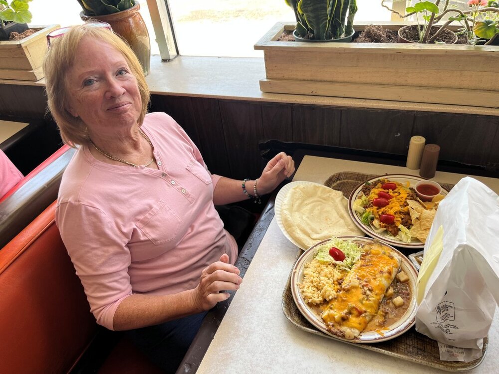 New Mexico is a wonderful state in its hidden treasures from the area NE of ABQ (where Art lives) up to Santa Fe and to Taos NM, then further up to Raton NM for the Santa Fe Trail Balloon Rally (we just happened by this rally when moving from VA to AZ back in 2005)! Then there is Ruidoso! It's Gods Country in Lincoln County NM of Billy-the-Kid and Smokey-the-Bear fame. Don't travel across southern NM without spending some time here. The area is named the White Mountains of NM, wild elk and feral horses walking the city streets daily and so many cute carvings Smokey is shops everywhere. If you're ever traveling through Albuquerque and need breakfast, lunch or dinner, or just great sides to go, like their amazing salsa and beans, Mexican meats and stews and much more, you've got to stop at the Frontier Restaurant. Just one exit S on I-25 of I-40, head a few blocks east on Central. This is my 4th visit here but the first time I parallel parked with an Oliver! (There was a car behind me when I parked and just a narrow alley in front). It worked out great and we could even keep an eye on our rig from the window seat! Chris had the Taco Salad and I enjoyed the Frontier Burrito, pints of salsa and beans to go for upcoming campsite dinners!12 points