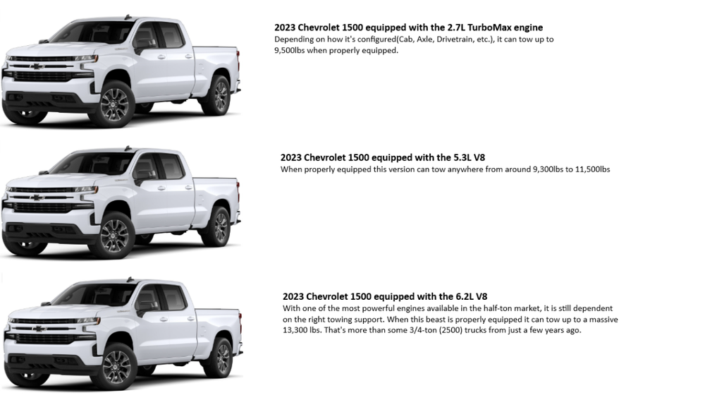 Truck Weight Class ≠ Tow Capacity Truth! Think your truck’s weight class tells you everything you need to know about towing? Think again. Many assume that a 1500, 2500, or 3500 series badge automatically dictates if a weight distribution (WD) hitch is needed—but that's not the case. Did you know? Today’s 1500-series trucks (a.k.a. half-tons) can tow anywhere from 7,000 to 13,300 lbs, depending on their specific configuration. Compare that to 1-ton trucks from the 1990s, which often maxed out around 8,500–10,000 lbs towing capacity. That's right—modern half-ton trucks can outperform the 1-tons of the past! 😲 Just because two trucks look identical on the outside doesn’t mean they have the same guts. You MUST: Check your exact vehicle build and tow rating. Consult your vehicle’s manual to see if a weight distribution hitch is recommended or required. Call your insurance company—some require WD hitch use when recommended by the manufacturer, others don’t. Additionally, while the Andersen Weight Distribution Hitch includes integrated sway control, it’s important to know that most half-ton trucks recommend the use of a weight distribution hitch when towing over 5,000 lbs—especially to help manage trailer sway safely. Bottom line: Don’t judge a truck by its series number. Know your numbers. Protect your tow. Example of 1500 Truck series and tow capacity ranges based on engine and other equipment: Please note: We are not recommending Chevrolet or any specific truck brand—this example was simply used to illustrate the wide range of towing capacities within a single truck class. Quick Tow Tip: Did you know that in most cases, a 2WD truck can tow more than a 4WD version of the same model? That’s because 2WD trucks typically weigh less, leaving more of the vehicle’s Gross Combined Weight Rating (GCWR) available for towing. Always check your specific truck’s tow rating!11 points
