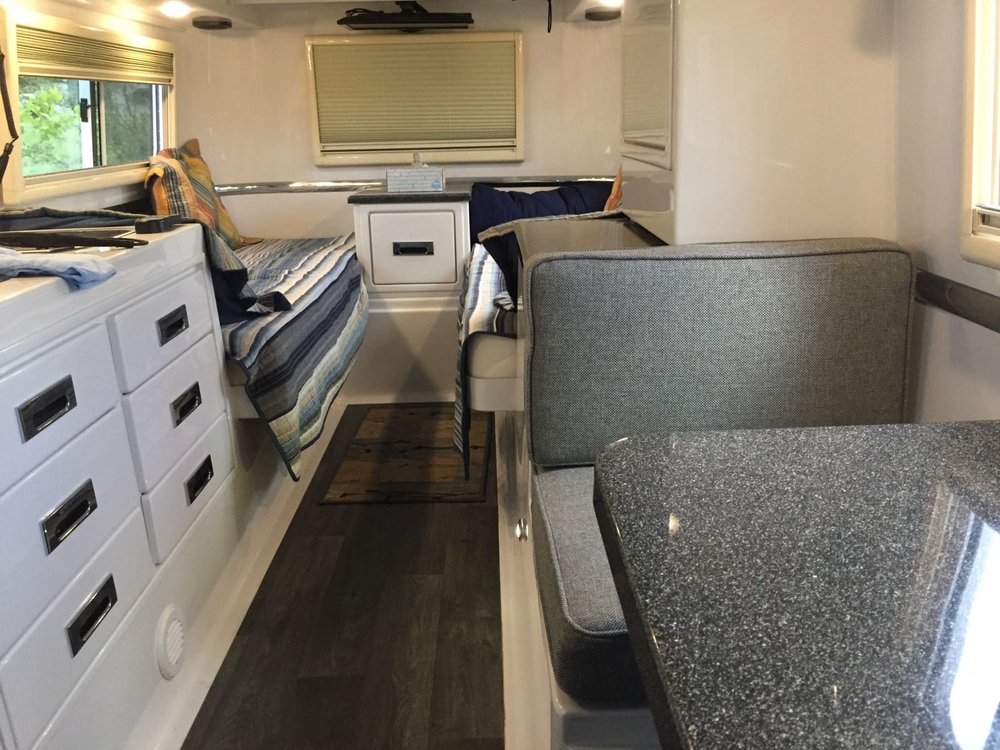 Our Ollie (#222) with black fiber granite (Dakota), Canyon Aspen flooring, and Tuxedo Grey cushions.