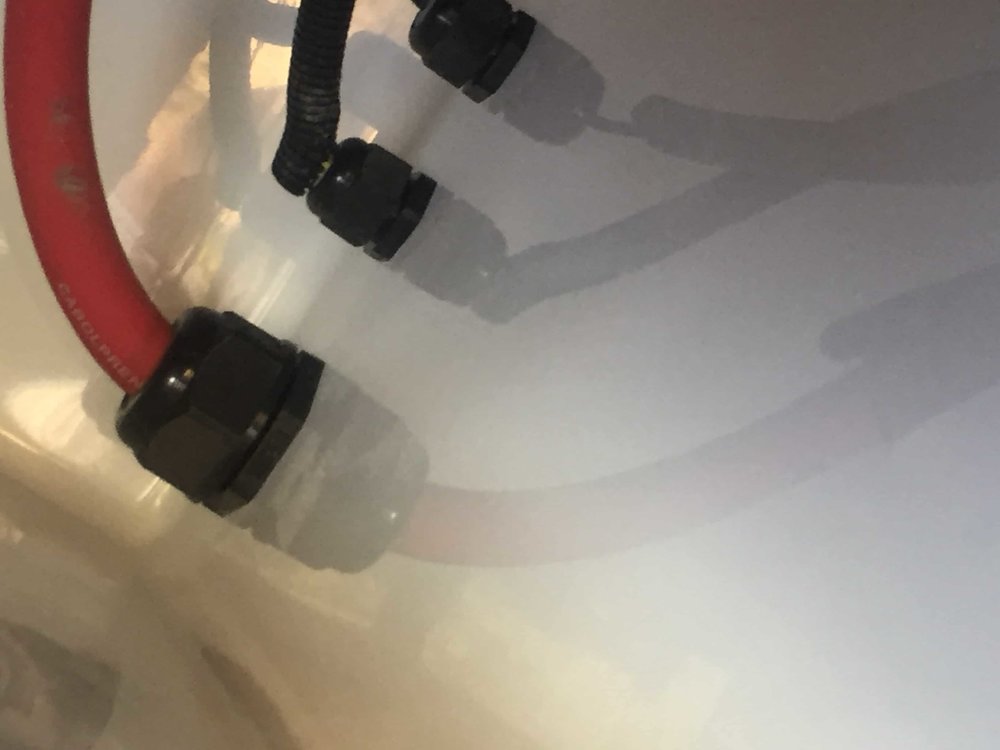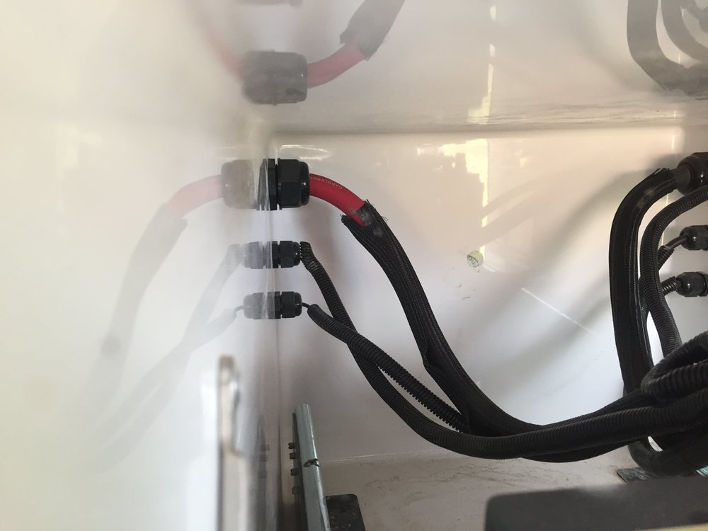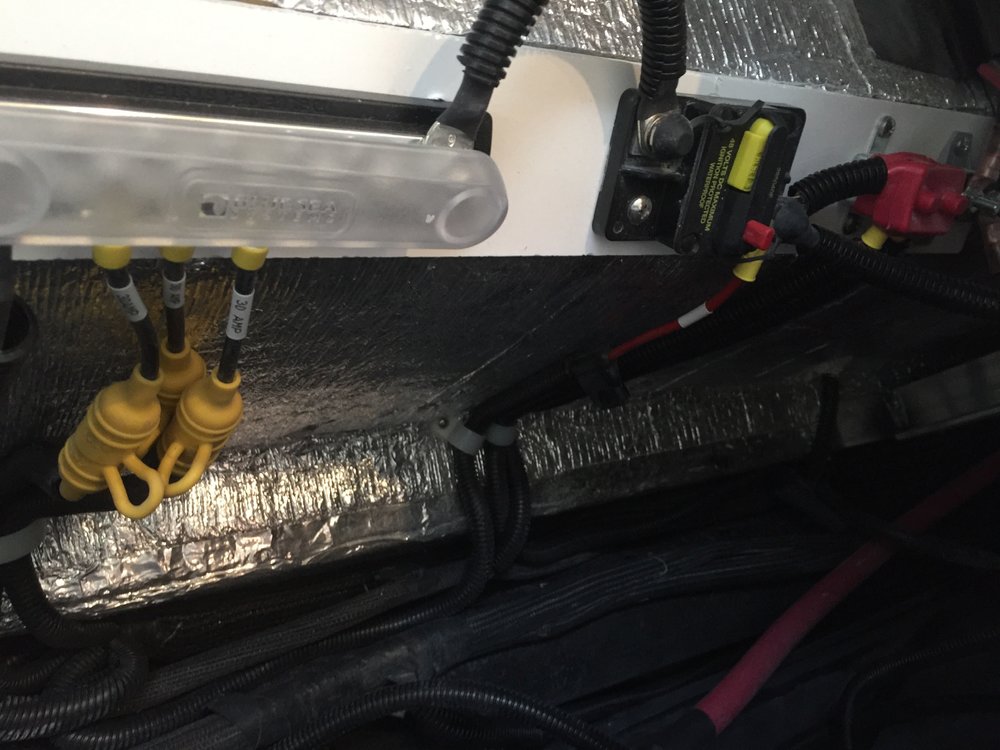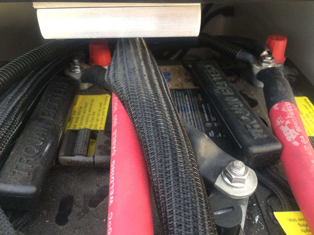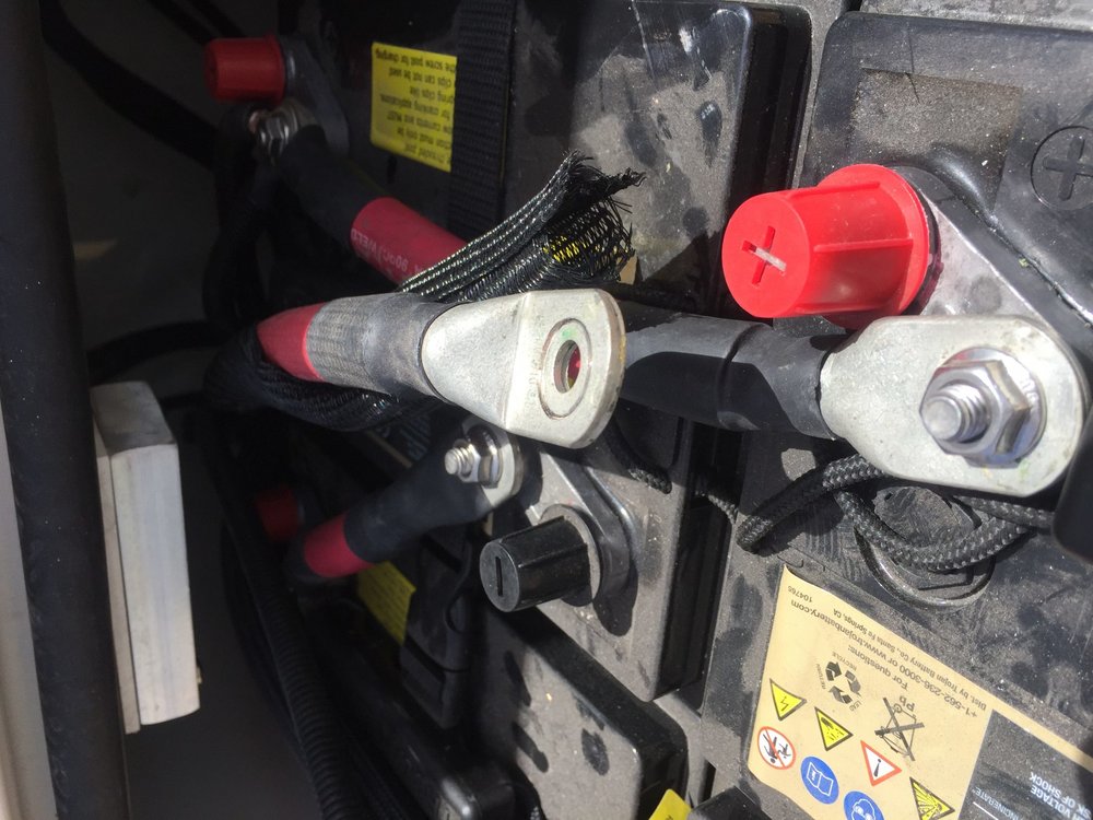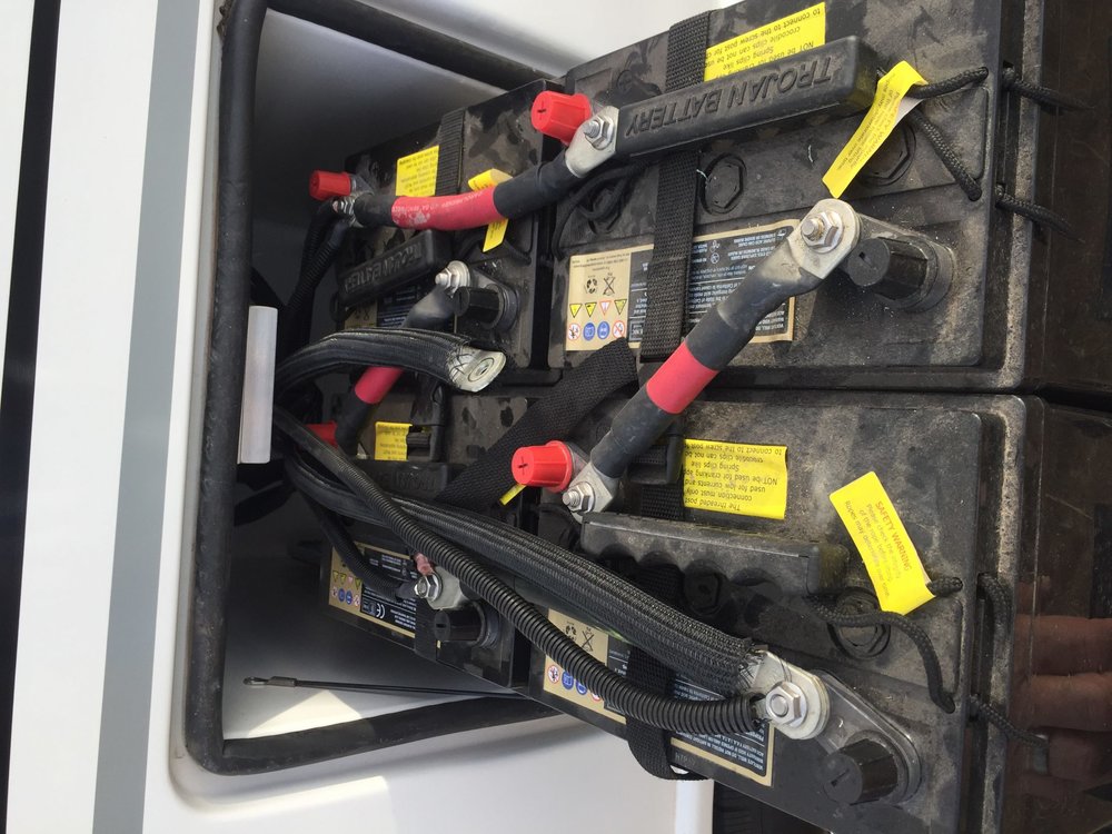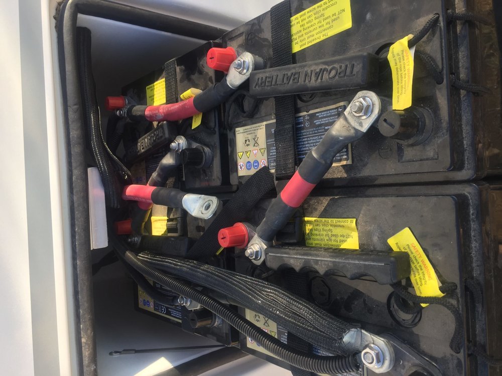 OK. I will try once more. I just took these two photos. One shows how the cable cannot be easily slid through the compartment to reach the forward battery terminals. The other shows the 8 terminals (though the photo has been turned 90 degrees in this display). I would like for someone, with a high degree of certainty, to tell me which terminal to attach the cable that delivers electricity to the inverter. (As reported before, I have received conflicting advice, and I don't want to risk damaging the system or myself.)