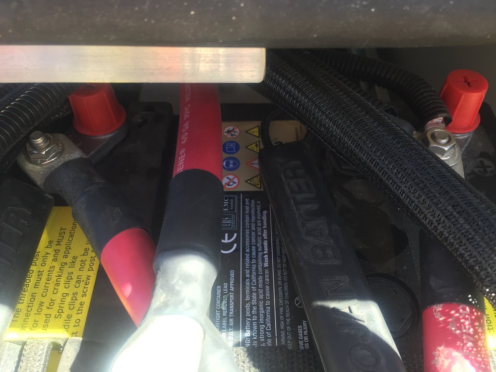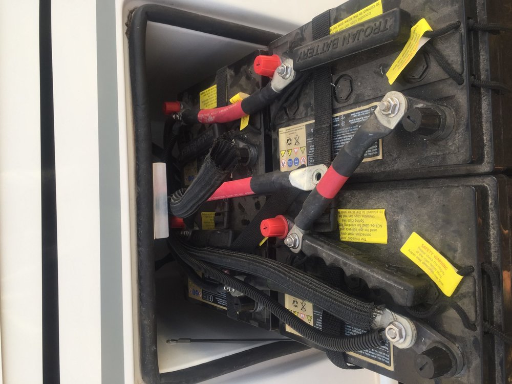 Well, if that indeed is the positive feed to the inverter, that would explain the situation. However, I see no indication that any of the terminals had this attached. Also, when the batteries, yes AGMs (see my original post), slide all the way out on the tray, the loose cable, if connected, would not reach the terminal that you mention. I think the attached photos are the best that I can get right now--one as a broader view, and the other more towards the back of the tray. I could, I suppose, attach this loose cable, but I am leery of doing so, for two reasons: 1) I don't want to damage something from my ignorance, and 2) it baffles me how it shows no sign (loose nuts, etc.) of ever having been attached. I will probably have to wait til Monday and have my RV repair guy take a look. Thanks so much for your input.