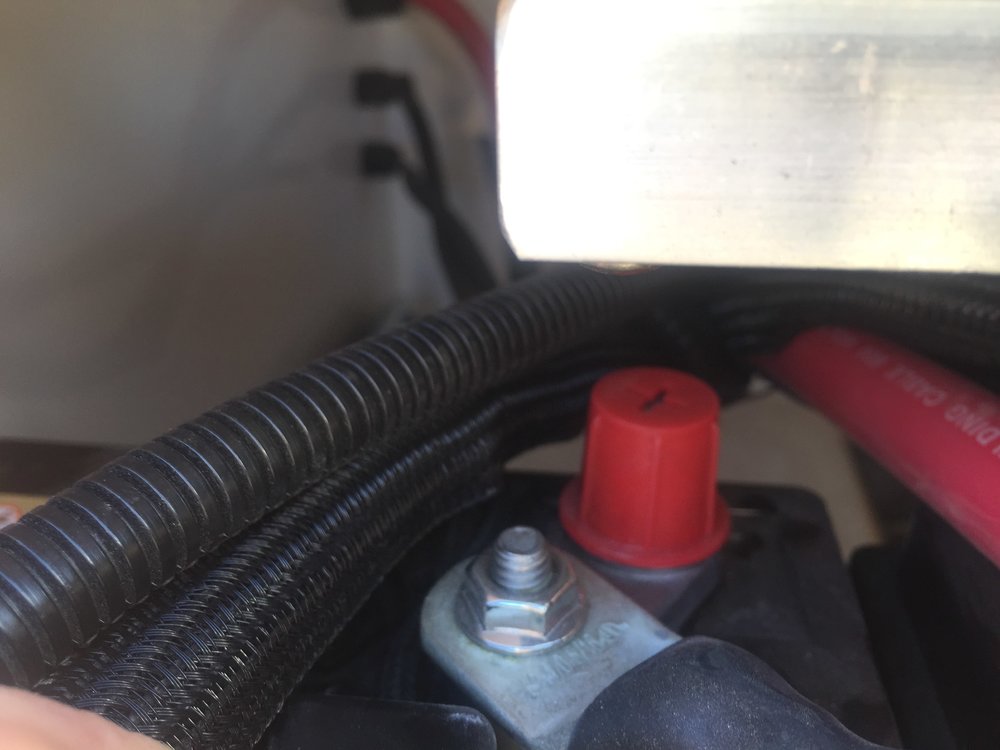 Just to be clear then, are you telling me that the cable going to the inverter needs to be attached to the right-hand terminal closest to me as I open the compartment? (I have received differing opinions on this.) Also (I just checked), the cable that you suggest pushing further into the compartment will not be pushed or pulled; it is secured to the compartment wall with a fixture seemingly meant to do so.