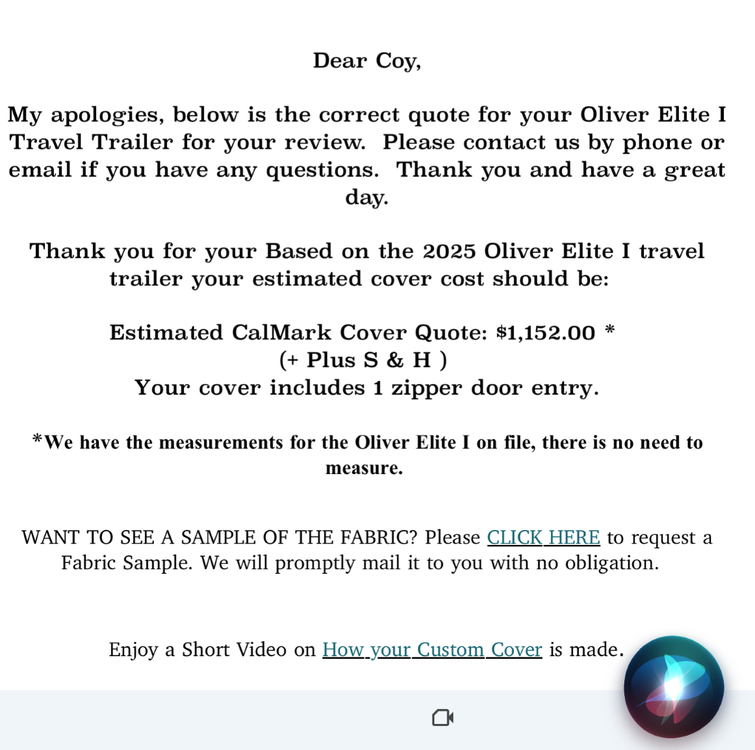 I am posting this for my friend Coy Gayle... I owned a 2014 Elite and decided to upgrade to a new 2024 Elite. I have always kept my trailer housed in a heated and cooled garage. There was not room in the garage for both trailers so I bought a new Calmark cover so that one trailer could be housed and the second protected under the Calmark cover. During this process, I had a friend contact me about buying the 2014 Elite and we made the deal. I had not anticipated the trailer would sell so fast and my friend came to my house picked up the trailer and took it home. I now have the Calmark cover in my garage, still in the original box, never opened or used. I have no need for it so I am offering it for sale at a considerable savings. The retail price of a Calmark cover with a zipper door is $1,152.00 plus shipping and handling S&H. I will sell the one I have for $700. I will be attending the Oliver Travel Trailer Owners Rally at Lake Guntersville, Alabama next week and will have it with me. If interested, you can purchase it from me at the rally or I can ship it to you for $700.00 plus shipping and handling. This is a savings of $452.00 for a brand new high quality Calmark cover for an Oliver Elite. I guarantee that this is an original Calmark cover, never used, and box never opened. If you have questions, please e mail me at Coy.gayle@gmail.com. I will reply or if you want to chat, send me your phone # and I will return your call. Coy Gayle