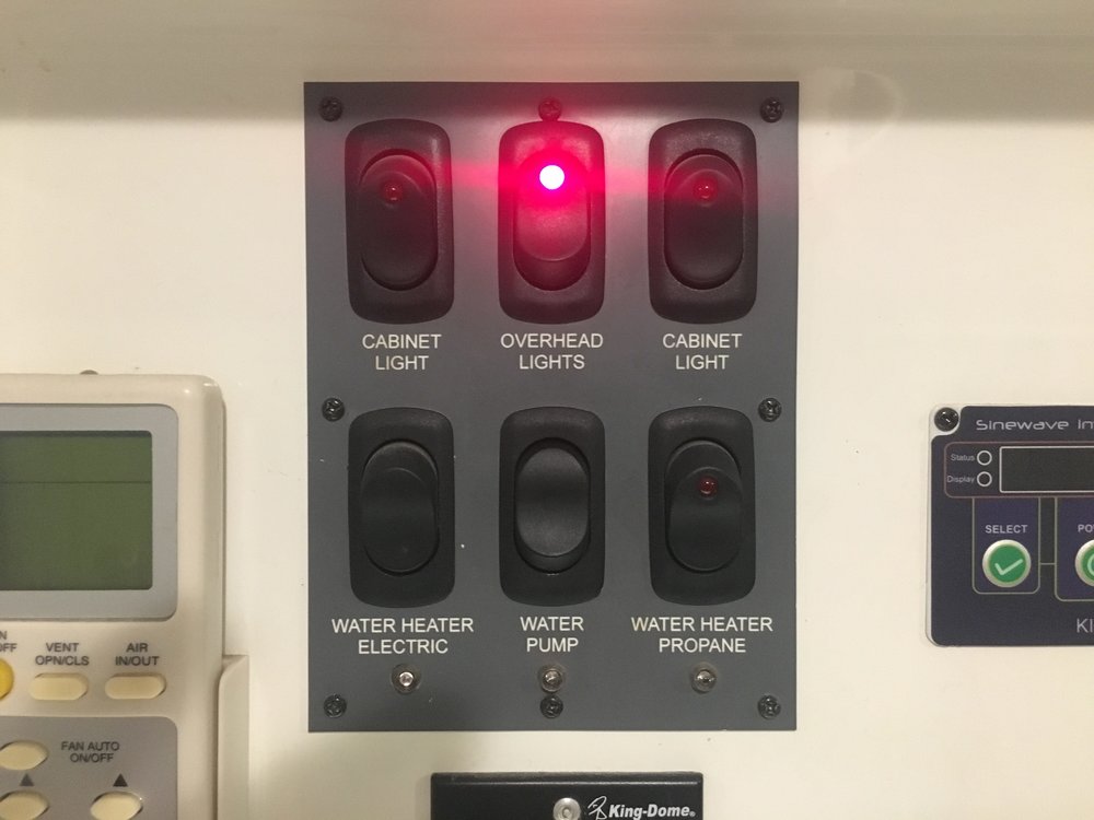 During our build I had an interior switch placed for the electric aspect of the water heater. The switch controls 12VDC power to a relay which controls 120VAC power to the heater. An LED illuminates to tell me the system is in the mode to provide power to the electric element and reminds me if I have left the system activated. Sure does make it easier than fiddling with a breaker or having go outside to turn it off or on.