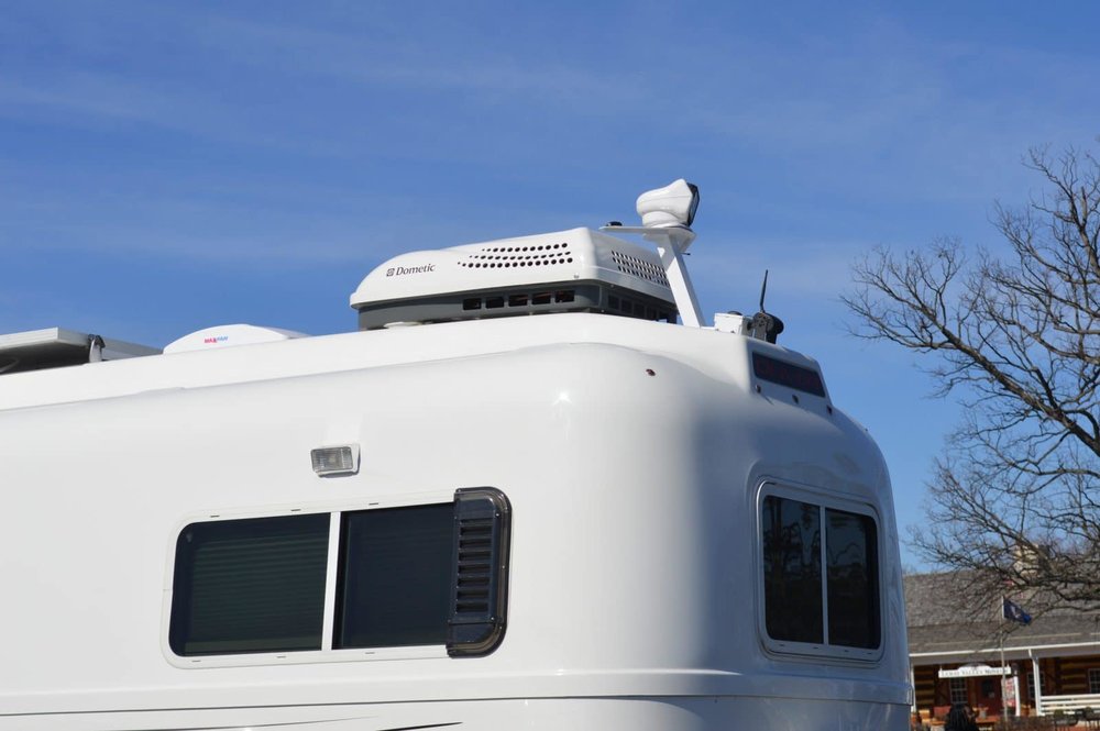 That Golight base and mast seen in my preceding post was conceived, constructed and mounted entirely by myself. I built it from aluminum and designed it to hold the light and the two antennas for the GPS tracking system. The light has a hand held remote control and can be operated from within the trailer or up to about 100 feet away. If the monitor for the rear view camera is brought into the trailer at night the light will help seeing things that are to the rear of the trailer. However, the camera does have IR LED's, so it can "see" in the dark. Among its many talents, the GPS tracking system is indeed for finding any "unauthorized users."