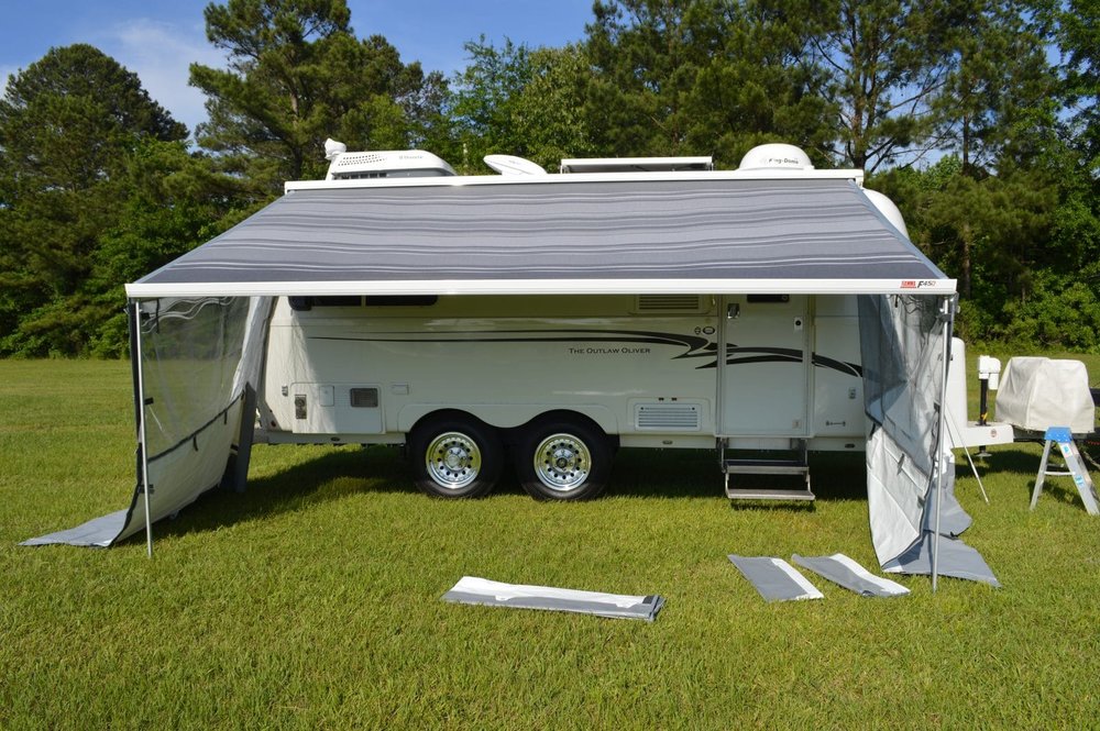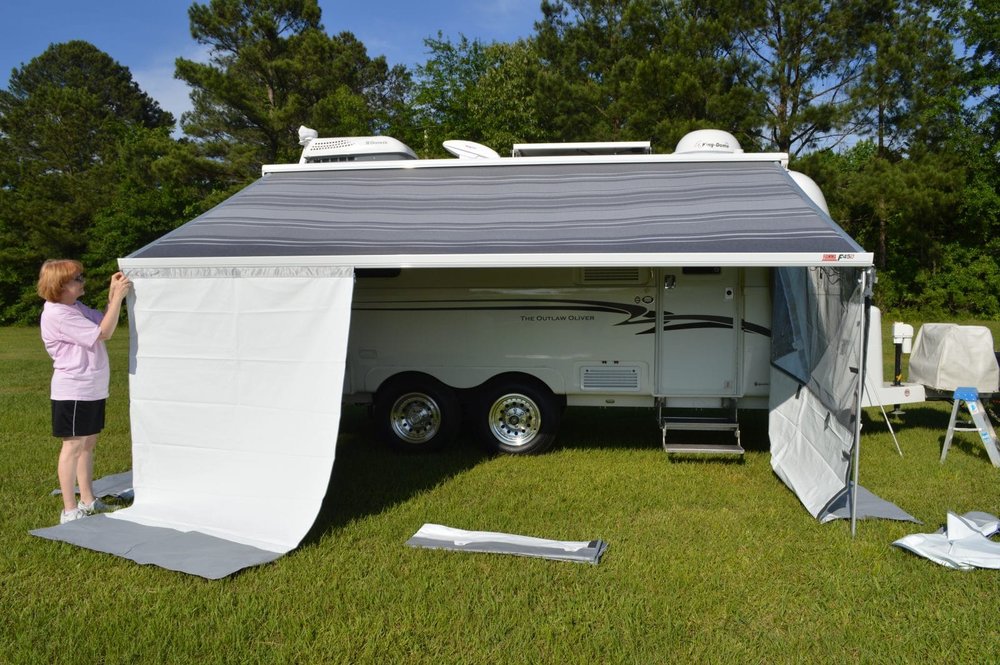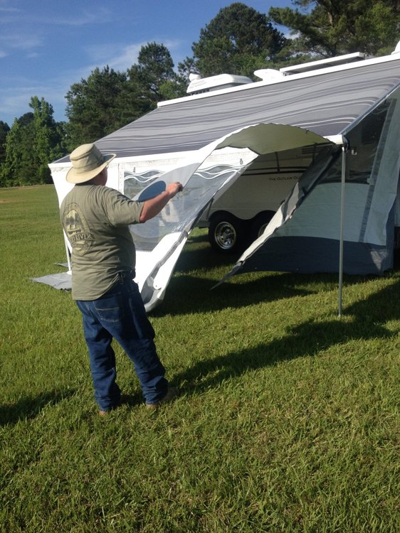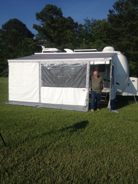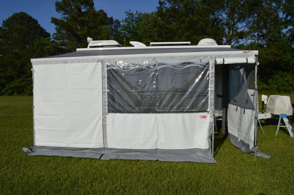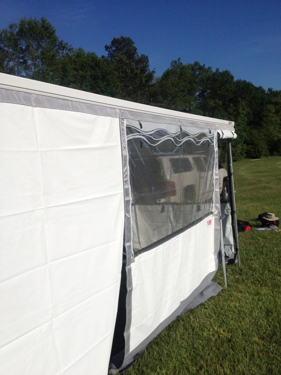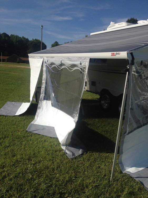 Reed & Karen: I hope you don't mind that I created a new thread for this and moved your post. This is what we have and it is made to fit the F45S awning that is installed on the Elite II. Setting it up takes about 15 minutes after you have done it the first time. There are a couple of accessories that have to be screwed into the awning and some assembling of other parts that only require being done once during the initial set up. The room's construction is top notch and it packs neatly away in its own (included) carrying case. It is heavy, weighing in at about 65 pounds. You do need to secure it to the ground in case of wind. I've included some pics of our initial set up and a couple taken during a recent trip to Maine.