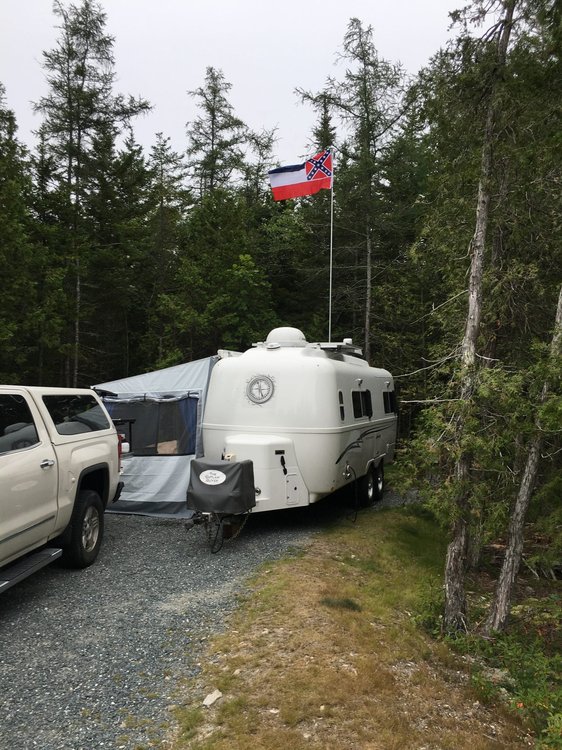 The Fiamma Privacy Room does not come with a skirt. Fiamma makes several different ones but we are making our own to get a better fit. Otherwise it is surprisingly tight. Another issue concerns the poles that go up against the side of the trailer. Since the sides of the Oliver are curved rather that vertical and flat, you need to drill an extra hole in the bottom of the rafter to accommodate the pin at the top of the pole. We were on Schoodic Peninsula in Acadia National Park. The NPS has built a new camping area there that is only about one year old.