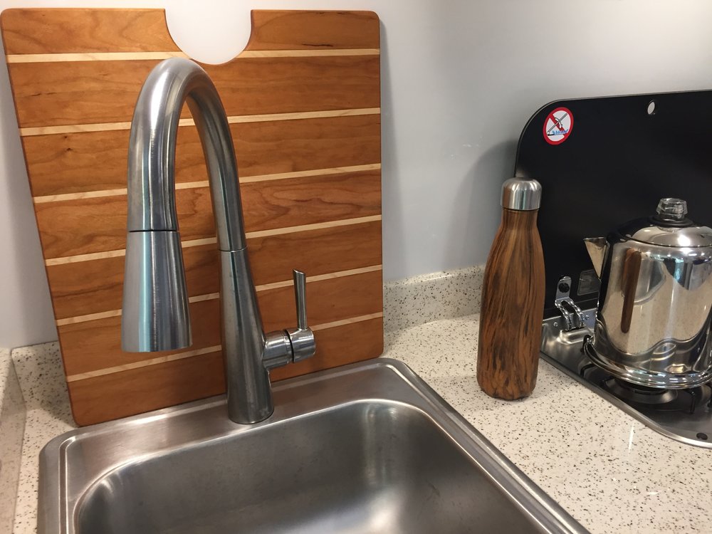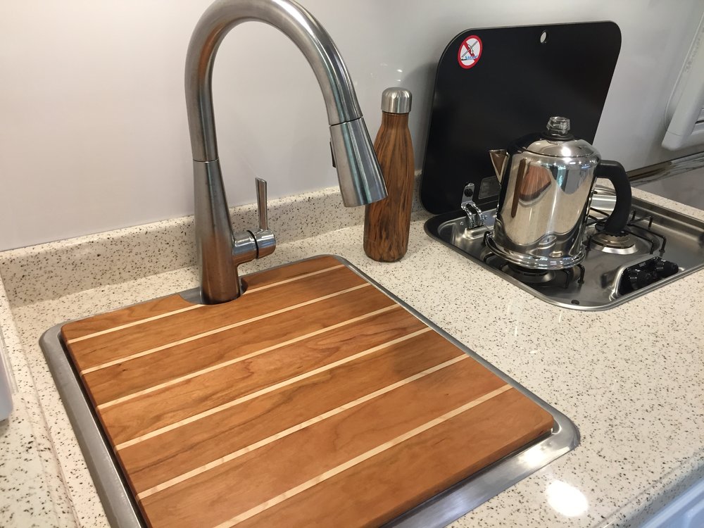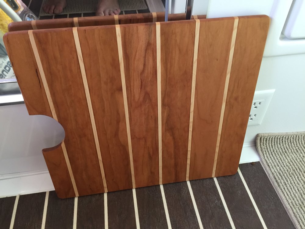 With "Roamy" home and in his storage place, I thought back to our first week of camping as we headed back to Florida from Hohenwald. We had wonderful times gazing out the windows at nature with morning coffee, dinners under the awning with fireflies and really peaceful nights of sleep. Being newly retired, I am still learning to slow down and relax so, this morning I decide to head out to the shop and build our first upgrade. So much for relaxing! Space being a premium, I want to give us some extra kitchen counter room by making a cutting board that would fit over the sink. In fitting out our Oliver we selected a flooring which emulates the deck of a sailboat. I wanted the cutting board to match that look. So with some quick measurements 2 5/16" for the darker strips and 1/4" for the lighter strips, I turned to the sink to get the overall dimensions inside of the raised aluminum band around the sink - 15" by 17". Looking over my wood supplies, I knew rock maple would be a great match for the narrow strips but the darker wood would be a challenge. I decide on American cherry knowing it would darken with age. Couple hours of milling, cutting, gluing, sanding and a few coats of mineral oil, my first upgrade was ready to use. Pictures below.