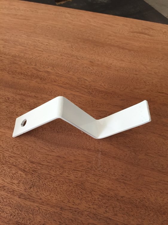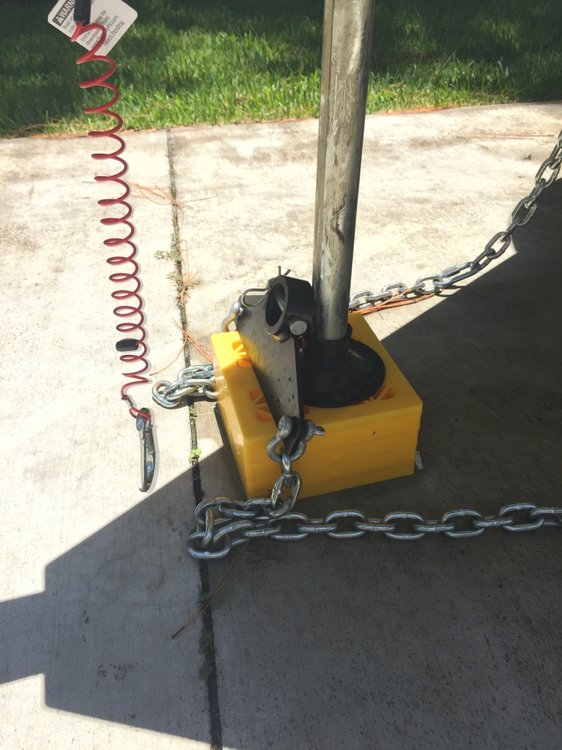 With Bill's lead, I used a piece of 3/4" flat steel and bend it into "Z" shape. Drilled a 3/8" hole to use the existing front jack bolt. Powder coated the hook and lined it with Velcro as a wear guard. Used stainless steel lock nut with rubber washer between nut and steel. Holds the Anderson wing and chains off the ground. -