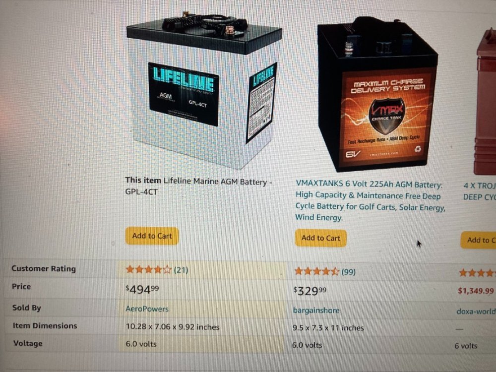 I am not concerned with spending money on something I need. I just want a system that is simple, good, and does what I want it to do. The AGM Lifeline batteries really did not live up to expectations. I am happy to use lithium but it gets more complicated. I am, and have been, maintaining the trailer. But not interested in doing it the rest of my life, whatever is left. Any suggestions for a reputable 6V AGM battery that isn't taller that 10 inches? I am happy to pay. And it isn't the money for maintenance, it is the lack of my know how. I do know my limitations. -