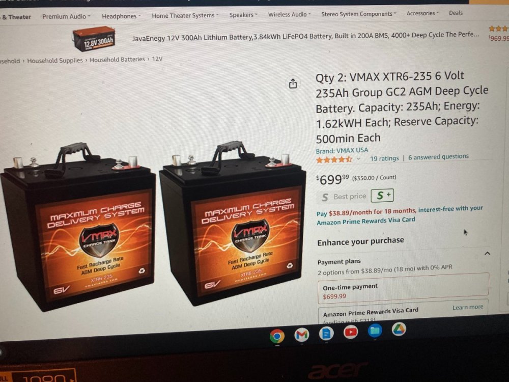 I am certain my two factory installed Llifeline gpl-4ct agm batteries need replacing as they won't hold a daylong solar panel charge. (My shore power is out at the moment.) I get them up to 11.1 Volts and within two or three hours they are down to 7 and slipping fast. What are the best replacement batteries for these two? I saw on amazon this option VMAXTANKS 6 Volt 225Ah AGM Battery: High Capacity & Maintenance Free Deep Cycle Battery for Golf Carts, Solar Energy, Wind Energy. I want to do what's best long term. I don't think I want lithium but will stay with AGM. Any suggestions or insight? (My elecrician still hasn't shown up. He says today.) I also saw this last double one but not sure if it is the right replacement. Ideas?