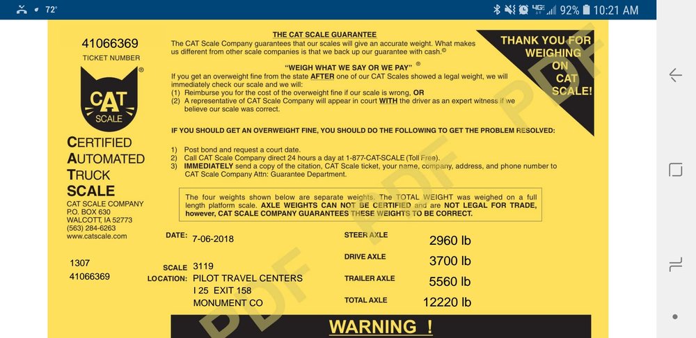 Here's the weigh ticket from my mostly-fully-loaded Ollie. I thought I had a full fresh water tank but it turned out to only be 2/3 full. Grey and black tanks were empty. That's with the whole family and dogs loaded in the car too, so I calculated tongue weight to be 620 lbs. (I have previously weighed the car empty) Since the fresh water tank is right over or a little aft of the axles I'd expect tongue weight to not increase with a full load of fresh water. As far as options we have that would effect weight, we have the 4x AGM batteries, 30 lb propane tanks, solar, two awnings, instant water heater (no 48 lbs of dead weight), and maybe the mattress upgrade adds some weight. -