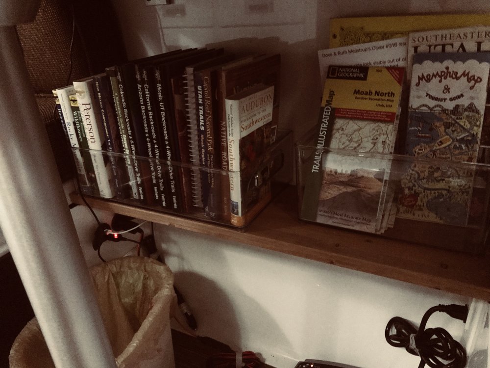We needed a place for our collections of road and nature guide books. We did something similar in our Casita. In our LE2, we used adhesive Velcro to attach a shelf in the rear of the dinette, under the table. We used 2 sizes of refrigerator boxes, also secured with adhesive Velcro. One holds trade sized paperbacks, the other accommodates larger formats and the various handouts one gets from campgrounds. It’s road-tested, and very secure, and doesn’t get in the way of our legs