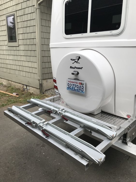 I'll get some pictures out shortly but in the interim to answer a few of the questions above. Home base for Sally and I is Normandy Park WA which is west of the Seattle airport SEATAC. We spend a lot of time in Sunriver Oregon as well. We are not full timing in the Oliver but think we might be out in it 1/3 of the time. We were doing weekends and vacations in our 2009 Airstream basecamp before purchasing the Oliver. Now that we are both retired we wanted something more comfortable and of good quality. Well we found it ! The bike rack has a good story about Oliver coming through for a customer . The bike rack was an option I ordered from Oliver back in October 2017 and had as part of my build until about February when I was on the phone with Anita making some changes to our order. She informed me that the bike rack was no longer offered and that there was no replacement as yet. When I had gone thru the initial option list in October I asked if I could get just the bike rack frame without the Yakima trays. I already had the One Up trays which attach to roof racks. Theses are very sturdy and attach with carriage 3/8 carriage bolts that are go in a T slot on the bottom of the tray. This makes the mounting width easily changed to the distance between your roof rack bars. I was told at the time that I could not get the frame only but had to order the whole thing and pay for the Yakima trays I did not need. Fast forward to February and now the rack is not offered. I inquired if I could get the parts and mount it myself. There was not a clear answer to this question so I waited a few weeks and asked again. Still no answer but a manger would be asked about it. No answer was forthcoming and I accepted I would have to work on a solution myself. When we got to Hoenwald the trailer was in the garage and ready to inspect and as I walked into the bay I noticed what looked like a bike rack frame leaning against the wall. I was then told that was my frame and if I still wanted it then I could purchase it on an invoice from the service dept. I got the frame and the four long 1/2 bolts. mounting blocks, quick disconnect pins and put it in the truck for later install. Turns out I got what I originally wanted and at 1/3 the cost of the full up bike rack. I installed the mounting blocks and took the frame to a local welder along with some short pieces of square 2x2x.25 6061 extrusion and had him weld three additional cross pieces in the frame. Without the additional cross pieces I would have likely had to drill 3/8 inch holes in the frame to mount the One up trays. Having the additional supports also would be handy in the event I wanted to mount a box on the rack in the future. So far no holes in the frame just the One Up mounting clamps that hold the trays. The One Up trays and bicycle bars that clap the wheels are very robust and I would not hesitate to put 100 lbs on each on the rack or a 200 lbs box with the trays removed.. My mountain bikes weigh approximately 32 lbs. I'll get you some pictures soon. Mark -