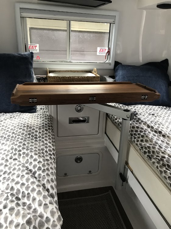 Overland The design and install are great work. I was about to commit to the Lagun Table for my build starting in May and changed it up and am cancelling the factory option and have ordered the table and Lagun mount as well as the parts from 80/20. Just in time advice (JITA). Thanks for sharing and your technical expertise. I noted in the pictures the Lagun mount was positioned so that the rear table edge was close to the night stand when the table axis is centered mid ship. Would be so kind as to post the dimension from night stand to center of mount. Thanks Roadrunner
